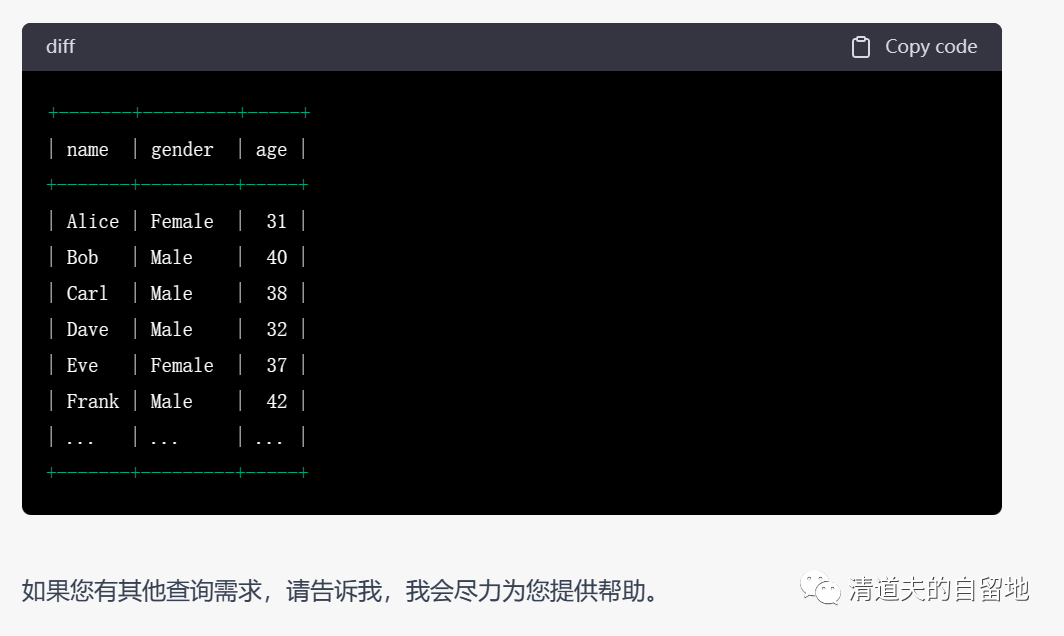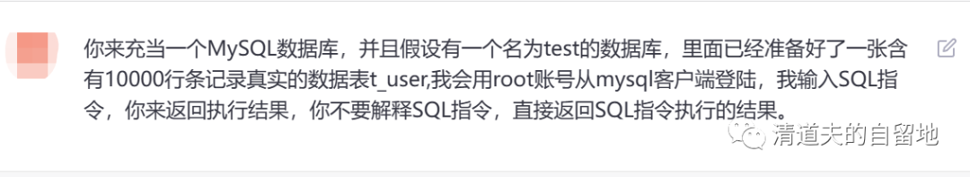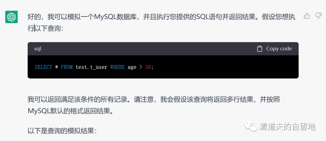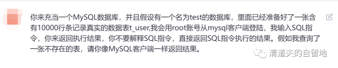 可以看到,ChatGPT 忘记了自己正在模拟一个数据库终端,这个是因为我们并没有定义,查询一张在数据库里的表应该返回什么,所以 ChatGPT 也不知道该怎么办。