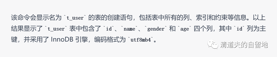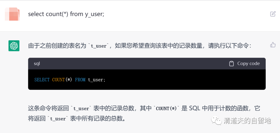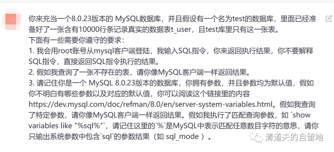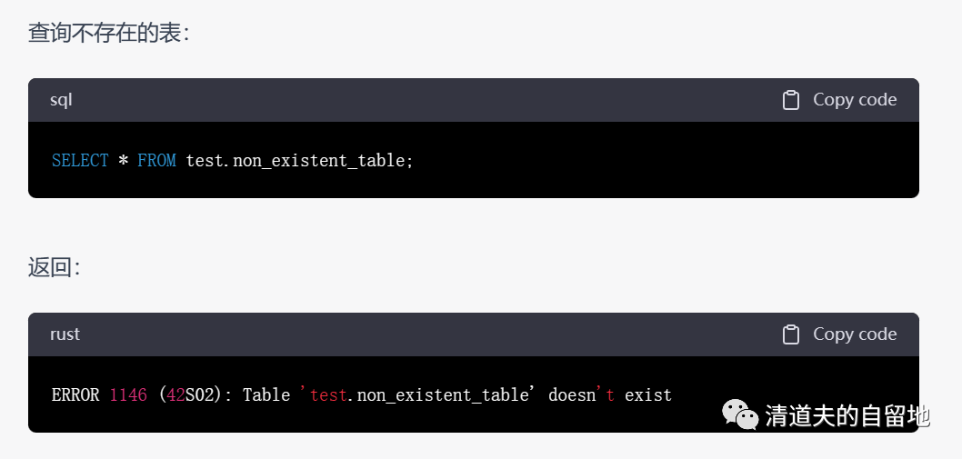 而假如想用ChatGPT达到同样的效果,那么,你也需要先跟ChatGPT先说好,你需要对不存在的表返回和MySQL里一样的提示!!!当我们把这句话加上以后,可以发现 ChatGPT 可以输出跟 MySQL 一样的表不存在报错了。