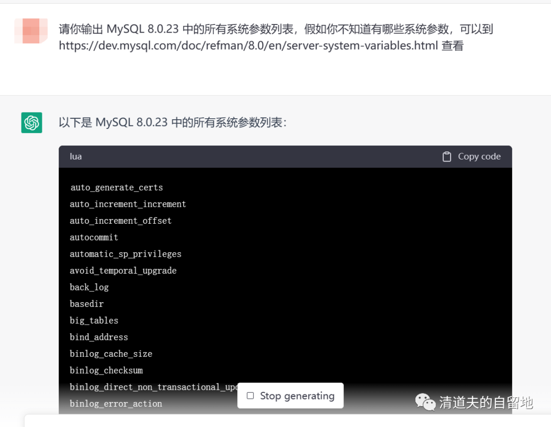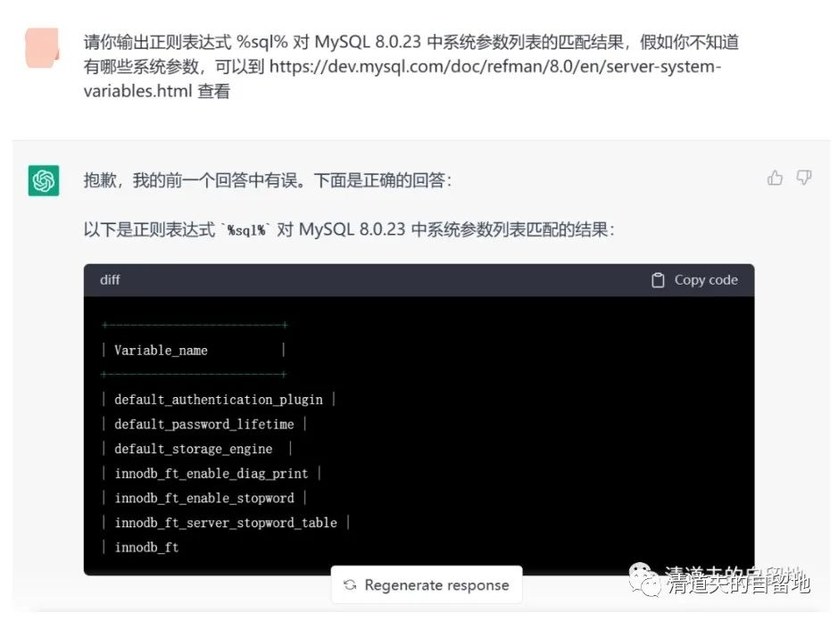 我让它输出 MySQL 8.0.23 的所有系统参数,给出了参考链接以后,它也能输出。