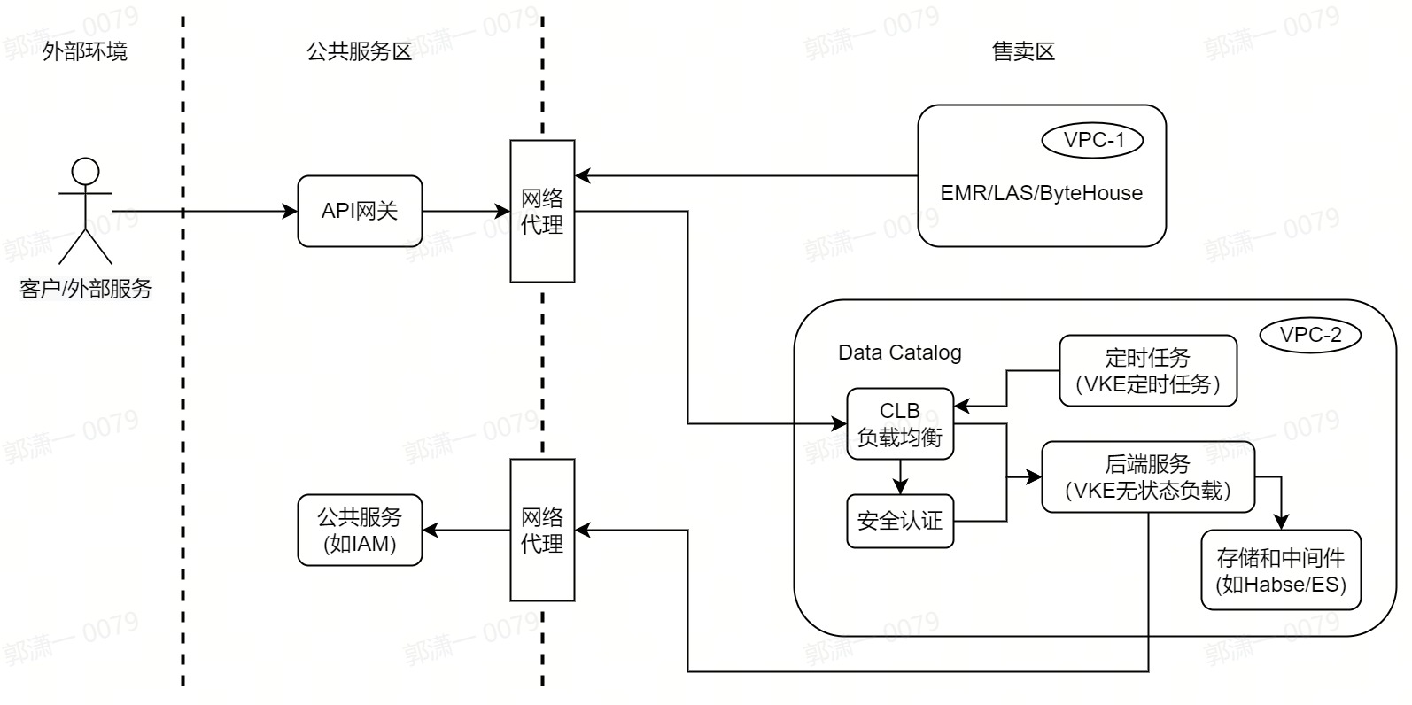 另外,Data Catalog对外会提供OpenAPI,外部客户可以通过火山引擎的API网关来访问这些API,但API网关服务是在公共服务区,无法直接访问到Data Catalog服务,基于以上情况,为了正常对外提供服务,我们需要解决网络隔离问题同时还要保证安全性。