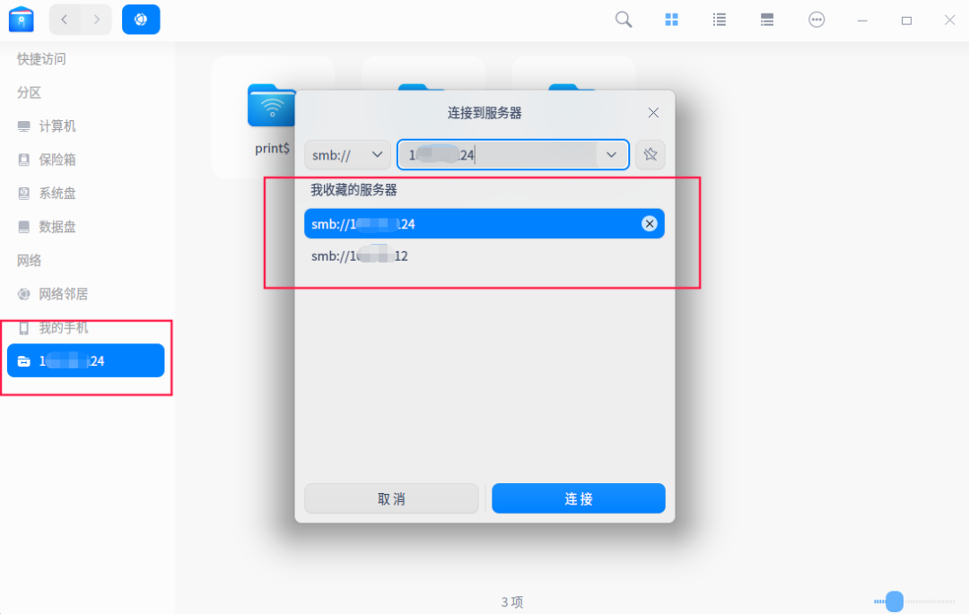 连接过的smb服务器地址将常驻在侧边栏和计算机磁盘中,便于下次快速连接。如果不需要常驻,也支持在设置中配置取消常驻。