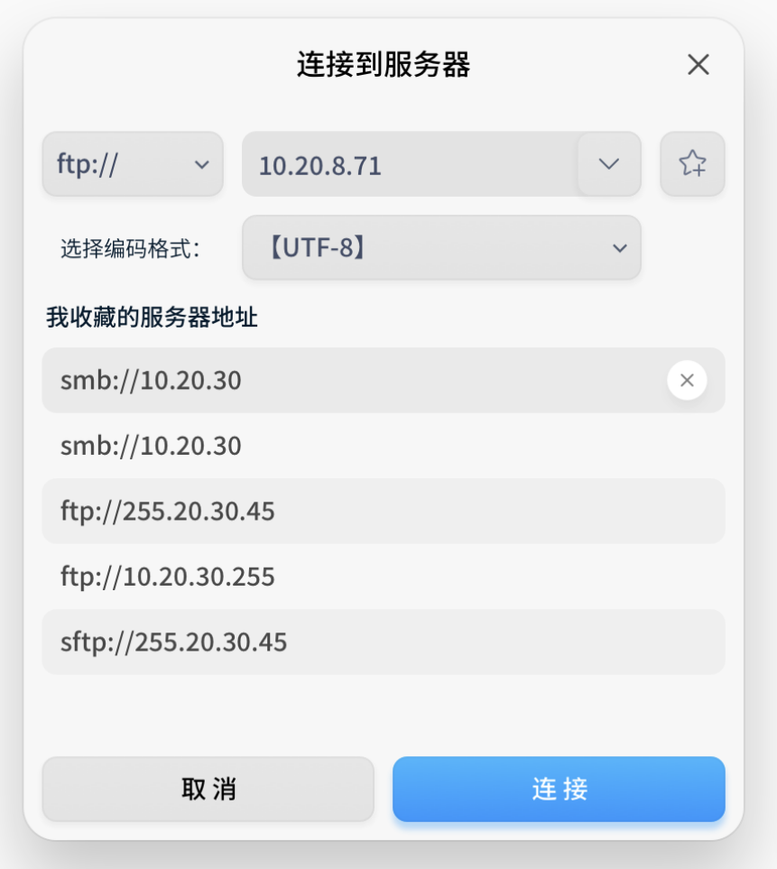 为了方便不同部门员工在共享目录下查找使用文件,新版文件管理器支持在“连接服务器”窗口中看到服务器访问记录,收藏自己常用的服务器地址,便于下次快速访问。