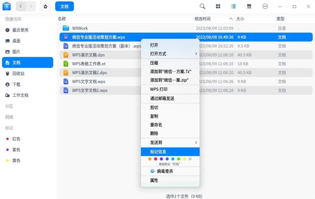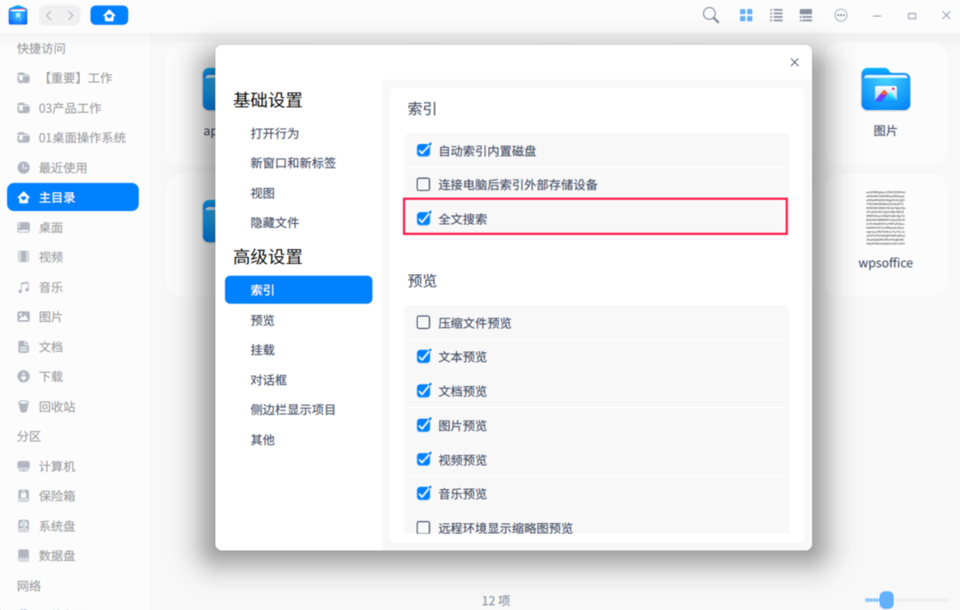 在查找某个文件时,如果只记得文件内容关键字,可在文件管理器设置中开启“全文检索”功能,在搜索中可以通过文件中的文字内容来搜索文件,支持搜索的文件格式有docx、xlsx、pptx、wps、pdf、txt等。