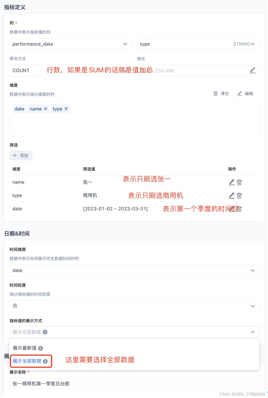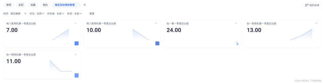 统计张一在第一季度所有的家用机安装数量,与上面新建的指标只有一个条件有差异,其它的条件完全可以复用,可以快捷方便的操作,试想一下,如果40多个售后员,80多个指标,只需差不多半个小时就能完成。