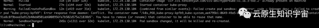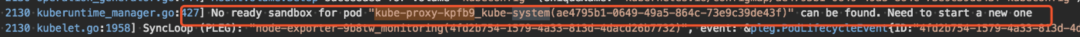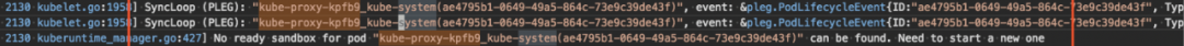 截图上是同一个 pod(kube-proxy)最近的两次 podWorker 逻辑截图,都抛出了同一个提示:No ready sandbox for pod <pod-name> can be found, Need to start a new one
