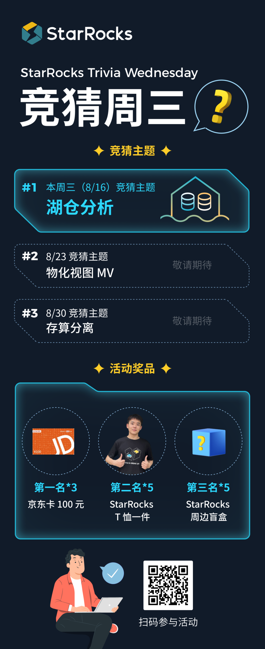 为了引导社区的伙伴们更加娴熟地驾驭 StarRocks 最新的特性,踏上速度与激情的征程,StarRocks 社区特别推出了“竞猜周三”的有奖问答活动。