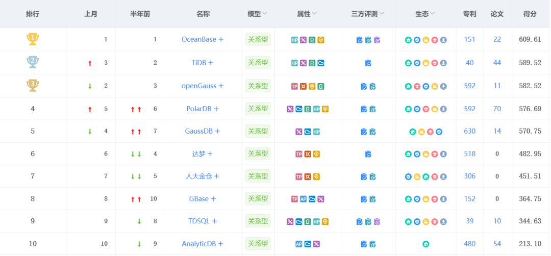 OceanBase 缔造了中国数据库排行榜的新神话,连续九个月夺魁,本月得分609.61分,受欢迎度不言而喻 。OceanBase 一直与第二名保持着较大的差距,遥遥领先中国数据库榜单。其一直与开发者维持密切的联系和深入交流,持续推动产品的技术创新,上月,OceanBase 收到在金融领域的捷报。国内首个全险种核心迁移至 OceanBase 系统已经稳定运行200余天,广受好评。 排名较上月上升一位至第二的 TiDB 本月得分589.52分,作为一款新兴互联网公司推出的产品,TiDB 的生态建设、运维工具、技术创新都能精准踩中用户的需求点。上个月,TiDB Serverless 正式商用,PingCAP 用户峰会 2023 的举办,持续加热话题传播和讨论度。 华为openGauss 本月以7分的微弱劣势退居榜单第三,新增30个专利。 openGauss 在社区建设上采取了多样的途径,走进校园、技术征文、线下活动、线下直播,以更加多样的社区活动,持续构筑 openGauss 的影响力。目前其已经在120余所高校开课,覆盖学生5000+,为中国数据库人才的培养贡献力量。 阿里云PolarDB 连续两个月排名持续攀升,虎视眈眈向前三。其本月得分576.69分,与第三名仅有5.83分的差距。 PolarDB 于2021年5月29日开源,通过降低准入门槛,吸引了大量的用户,目前在 GitHub 上的 Star 数已达到2.6K。阿里云PolarDB 在生态成果和多云趋势的双重助力之下,不断巩固云数据库桥头堡的位置。 华为云GaussDB 本月排名较上月下降一位,位列第五,新增68个专利。 GaussDB 是华为云在数据库领域深耕细作的产品,其诞生之时就身披荣光。近年来,自主化数据库替代成为了金融数字化发展的趋势,GaussDB 凭借深厚的技术积淀,辅以技术与生态之力,在金融领域占据优势地位,获得众多用户的关注。 从高校里“走”出来的一款数据库——达梦,本月维持上月排名,以482.95分位列第六。 达梦自申请上市后,市场捷报连连,尤其在党政领域获得先发性优势。上个月,达梦数据库中标辽宁省阜新市数字政府建设项目,在中国石化多个系统的成功上线。市场作为检验产品的一块“试金石”,达梦数据库众望所归。 人大金仓本月得分451.51分,新增33个专利,以深厚的积淀维持上月排名,位列榜单第七。 人大金仓砥砺前行,在“实战”中不断进化完善。上月,人大金仓助力中石化资产管理系统成功上线,顺利在中石化总部和7家二级企业试点运行,助力中石化各类资产高效管理及优化。 GBase南大通用本月得分364.75分,维持上月排名居第八。 GBase南大通用二十年专注数据库产业,自成立之初就瞄准“高标准、高要求”的金融、电信等重点领域,拥有全面的产品矩阵,近年来一直在免费线上培训方面发力。目前 GBase 在银行、保险、证券等细分领域核心系统、业务系统、数据仓库系统都树立了标杆应用案例。 腾讯云TDSQL 作为腾讯自主研发的企业级分布式数据库,目前已经应用在金融、政府、电信、医疗等行业的核心业务系统。其本月得分344.63分,位列榜单第九。 自腾讯云数据库 TDSQL 性能打破世界纪录后,其影响力大幅增加。腾讯云数据库致力于打造企业级数据管理平台,从金融级高可靠高可用、领先的架构与性能、智能化运维管理及企业级数据安全合规等四方面赋能数字企业,释放数据生产力。 AnalyticDB 是阿里云自主研发的云原生数据仓库,采用存储计算分离+多副本架构,连续六个月蝉联榜单第十。 7月25日,阿里云在印尼雅加达举行首届瑶池数据库国际峰会,会上阿里云发布了内置向量引擎功能的最新版云原生数仓 AnalyticDB,用户仅需30分钟即可构建专属生成式AI应用。“数据库+AI”的紧密融合将为中国数据库产业带来更多的活力。