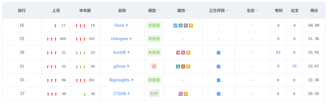 Doris 是由百度自研并开源的 OLAP 数据库,以易用的特点被业内熟知,本月排名较上月上升一位至第16名。其是一款基于 MPP 技术的分析型数据库,能够在海量数据场景下提供毫秒级查询服务。目前,Apache Doris 已经进入开源的第六年,并于2022年6月成功从 Apache 孵化器“毕业”,成为 Apache 顶级项目。据公开资料显示,Apache Doris 在全球范围内的企业用户规模已超过1000家。 本月排行榜中的黑马阿里云Hologres 是新增参与排名的数据库,其排名直逼前二十,所向披靡向上游。实时数仓 Hologres 同阿里巴巴核心业务一起成长一起打磨,支持海量数据实时写入、实时更新、实时分析,支持标准SQL(兼容PostgreSQL协议)等。继 Teradata 退出中国后,中国实时数仓这一市场空白有望被中国厂商填补。 分布式交易数据库 KunDB 是星环科技打造的分布式关系型数据库, 具有可扩展、 高并发、 高可用特性, 对于现代数据库的需求提供了通用的解决方案。其本月排名上升3位至第28名。近日,KunDB 通过中国信通院首批“软件自研创新能力”专项评估,表明了其在“自研率高、安全性强、合规度高、稳定性好”等方面具有国内领先的自研水平和可信度,值得关注。 gStore 本月得分33.67分,位列8月中国图数据库榜单第二名。gStore 是由北京大学王选所数据管理实验室研发的,面向 RDF 知识图谱的开源原生图数据库系统。近年来,知识图谱是一个热议话题,gStore 围绕知识图谱打造了一系列生命周期的产品栈,因此引人瞩目。 贝格迈思(Bigmath)自主设计研发采用C++开发的新型智能数据库 AiSQL 产品 BigInsights ,本月排名较上月迅速攀升63名,现位列第33名。其针对高速高并发的实时决策分析应用场景具有其高效性能,如量化交易、金融欺诈监测、在线交易支付与验证、ICU 医护监测、网络安全、电子竞技、风险管控、应急指挥以及物联网时序数据等实时分析决策场景,都具有广泛的高效适用性。 作为中国时序数据库领域的佼佼者,腾讯云 CTSDB 位列8月中国时序数据库榜单第五名。这款数据库高并发写入、冷热数据、物联网等场景等做了大量优化,作为腾讯唯一的时序数据库,CTSDB 支撑了腾讯内部20多个核心业务,包括微信彩票、财付通、云监控、云数据库、云负载等。
