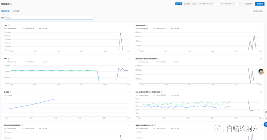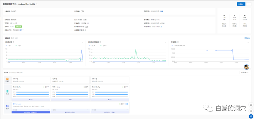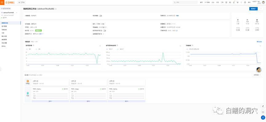 从集群控制台上,我们可以可以进行简单的监控,也可以进行集群的管理与调整。性能监控界面可以分别查看数据库和服务器的性能与负载情况。