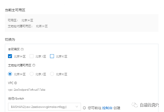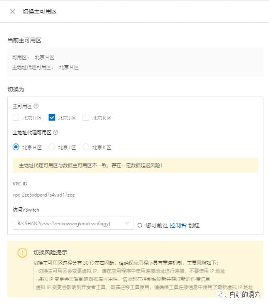 下面我们进行一次切换住可用区的操作。将主可用区从H区切换到J区,模拟一次H区机房的故障。