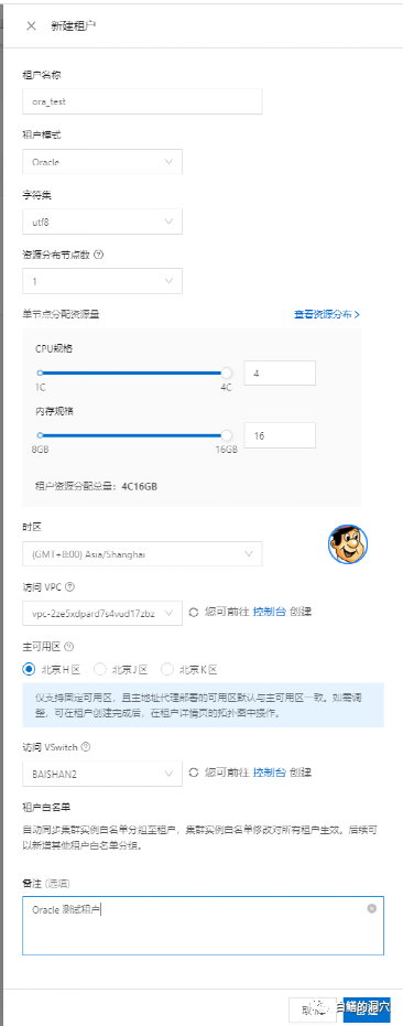 首先我选择了单可用区的模式,只有北京H区承载写业务,其他两个区都是备用的。先创建一个Oracle租户,将全部资源分配给Oracle租户,然后进行一些简单的测试。