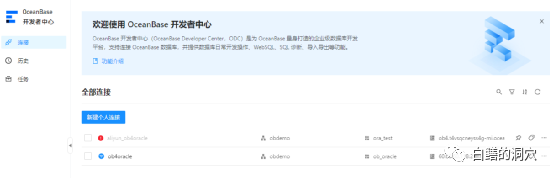 我曾经尝试使用Windows上安装的OB DEVELOPER CENTER连接云上版本的ob4,不过没有成功,云上版本的Oracle租户的连接串有些不同。个人测试的结果觉得可能因为在Oracle租户的连接时不能使用租户参数,而Oceanbase开发者中心连接数据库时租户是必选项,因此可能二者存在一些冲突。