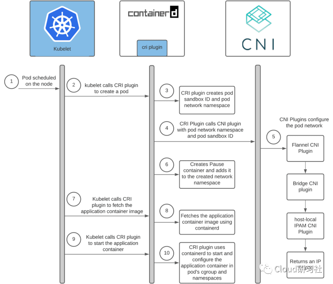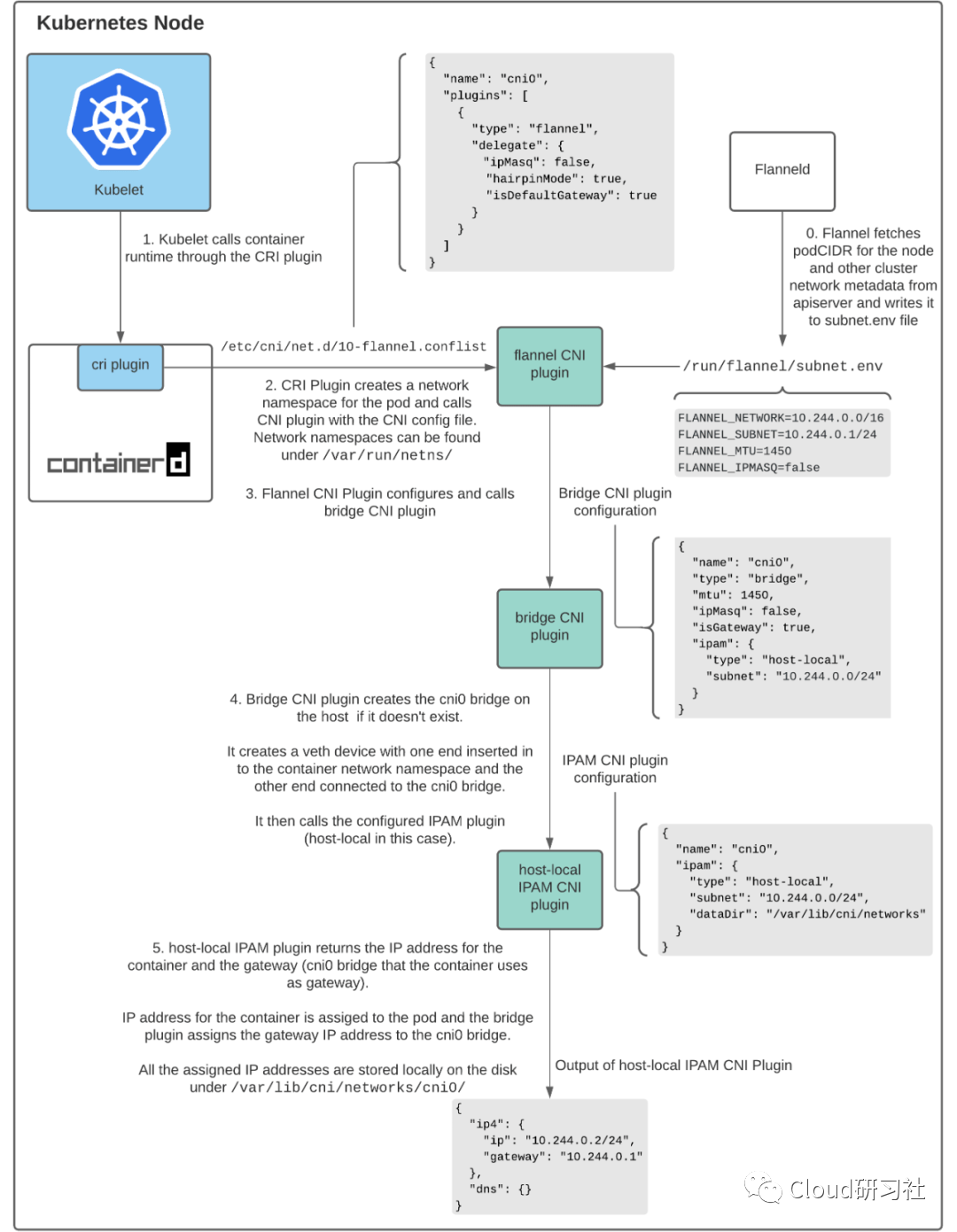 本文中我们将 Flannel 作为 network provider,这里简单介绍一下 Flannel 的设置。Flanneld 是 Flannel 守护程序,通常 install-cni 作为带有初始化容器的守护程序安装在 Kubernetes 集群上。install-cni 容器创建 CNI 配置文件在每个节点上 /etc/cni/net.d/10-flannel.conflist。Flanneld 创建一个 vxlan 设备,从 apiserver 获取网络元数据,并监控 Pod 上的更新。创建 Pod 时,它将在整个集群中为所有 Pod 分配路由,这些路由允许 Pod 通过 IP 地址相互连接。Containerd CRI 插件和 CNI 插件之间的交互可以如下所示:如上所述,kubelet 调用 Containered CRI 插件创建容器,再调用 CNI 插件为容器配置网络。Network provider CNI 插件调用其他基本 CNI 插件来配置网络。CNI 插件之间的交互如下所述。有多种 CNI 插件可帮助配置主机上容器之间的网络,本文主要讨论以下 3 个插件。当使用 Flannel 作为 network provider 时,Containered CRI 插件使用 CNI 配置文件,调用 Flannel CNI 插件:/etc/cni/net.d/10-flannel.conflist。Fannel CNI 插件与 Flanneld 结合使用,当 Flanneld 启动时,它将从 apiserver 中获取 podCIDR 和其他与网络相关的详细信息,并将它们存储在文件中/run/flannel/subnet.env。Flannel CNI 插件使用 /run/flannel/subnet.env 的信息来配置和调用 Bridge CNI 插件。Flannel CNI 插件使用以下配置调用 Bridge CNI 插件: