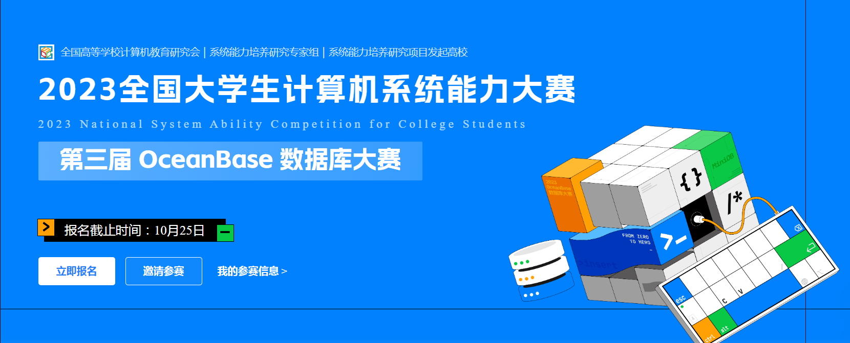 即日起,选手可通过全国大学生计算机系统能力大赛官网、OceanBase社区官网报名,报名截止2023年10月25日。