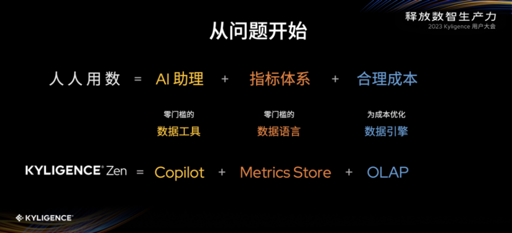 AI助理,它能够提供“零门槛”的数据工具,是“人人用数”这个拼图中最关键的一个部分,解决的就是数据工具连通性“最后一公里”的问题;而指标体系,在数据分析体系中,则能够提供一个通用的、零门槛的“数据语言”,是企业数据共享和协作的前提;而合理成本,则指的是为成本优化的数据引擎,即通过OLAP优化数据,最终让AI赋能业务场景,带来更大的价值和回报。