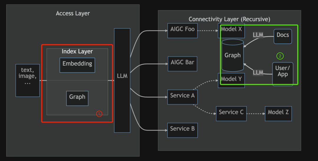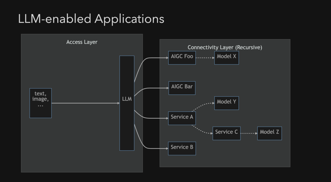 如上所示,目前我们利用大语言模型,将其当作通用智能感知层(接入层),再对接各类传统服务 Service 或者是生成模型服务 AIGC 的应用架构大概是这样。