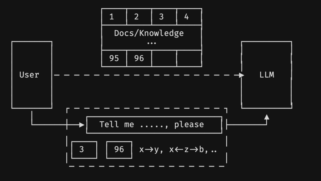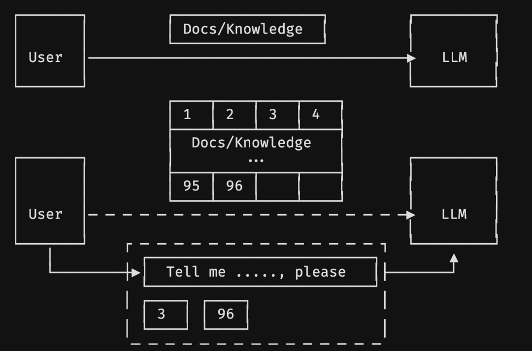 一般来说,我们使用 RAG 时,会对文档进行 Embedding(对应上图的 1、2…96 分片),而我们提问“Tell me ...., please” 时,也会进行 Embedding,再在 vectordb 向量数据库中进行 TopN 的匹配搜索返回,将最接近它的文档块(对应上图的 3、96)作为上下文,同问题一起输入给大语言模型。