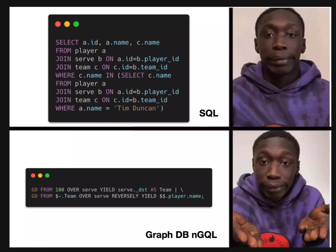 简单来说,假如你有海量的图关联场景,你用非图的数据库写查询语句(像是上图 SQL 部分)。虽然理论上 SQL 是可以实现多跳的查询,或是查询是两点之间任意的路径,但往往这个查询语言不好写,并且响应速度满足不了业务需求。简单来说,非常痛苦。