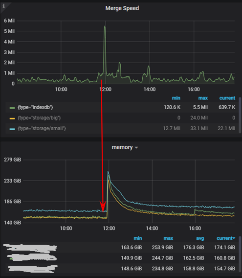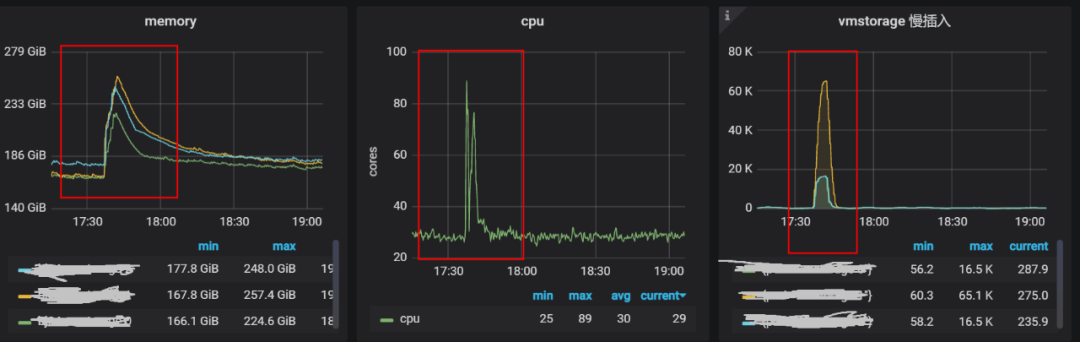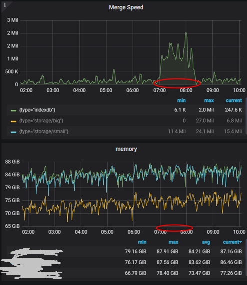 我们对 VictoriaMetrics的详细指标进行分析。发现 vmstorage 组件在底层执行 indexdb merge 操作的时候,其 CPU、内存等资源使用量会有一个突增, 即indexdb 的 Merge 操作非常消耗资源。