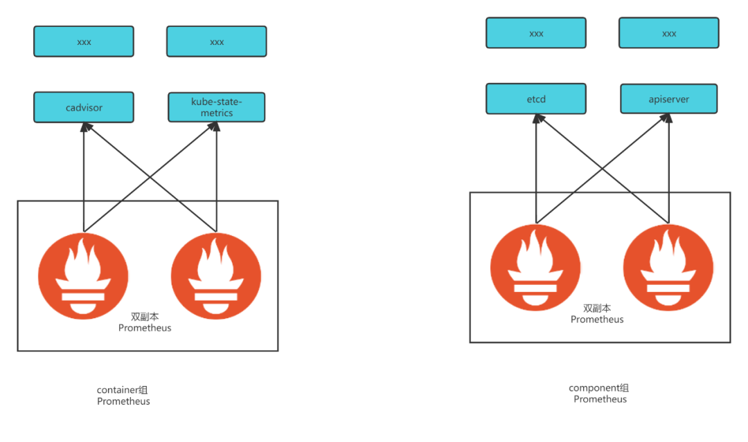 将监控 target 进行分类交由不同的组 Prometheus 采集,且每类 Prometheus 为双副本模式。随着集群规模的增加,发现当前模式的不合理之处,即因为Pod维度监控数据量级十分高,导致container 类型 Prometheus 负载远远高于其他类型的 Prometheus。在高负载的情况下面会发生重启,remote_write 异常等情况。