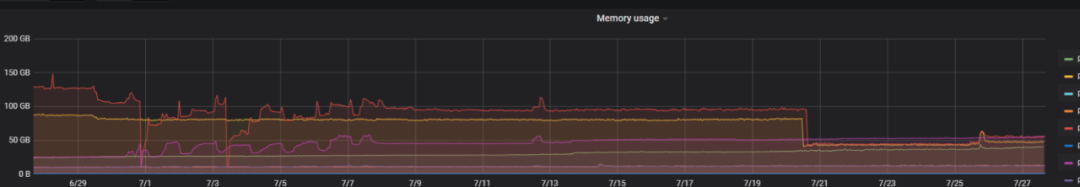 我们的第2个修改点在 Prometheus的数据存储时间上,Prometheus的默认存储时间为2周,后续测试发现 Prometheus的存储数据时间对内存的影响很大,且现在监控数据的持久化存储都放在 VictoriaMetrics 上面,Prometheus存储的数据主要用于排查问题,不需要承担持久化存储的任务。故我们修改Prometheus采集的数据本地存储时间从7天改为2天。Prometheus 内存消耗降低 40%。