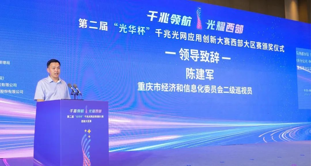 2023年8月14日,第二届“光华杯”千兆光网应用创新大赛西部大区赛颁奖仪式在重庆举办。本次西部大区赛以“千兆领航 光耀西部”为主题,由重庆市通信管理局、重庆市经济和信息化委员会指导,中国信息通信研究院(以下简称“中国信通院”)主办,内蒙古自治区通信管理局、四川省通信管理局、西藏自治区通信管理局、陕西省通信管理局、甘肃省通信管理局、青海省通信管理局、宁夏回族自治区通信管理局、新疆维吾尔自治区通信管理局特别支持,中国信通院西部分院等单位联合承办。本次西部大区赛决赛及颁奖仪式在人民网进行线上直播,吸引187万余人次观看。