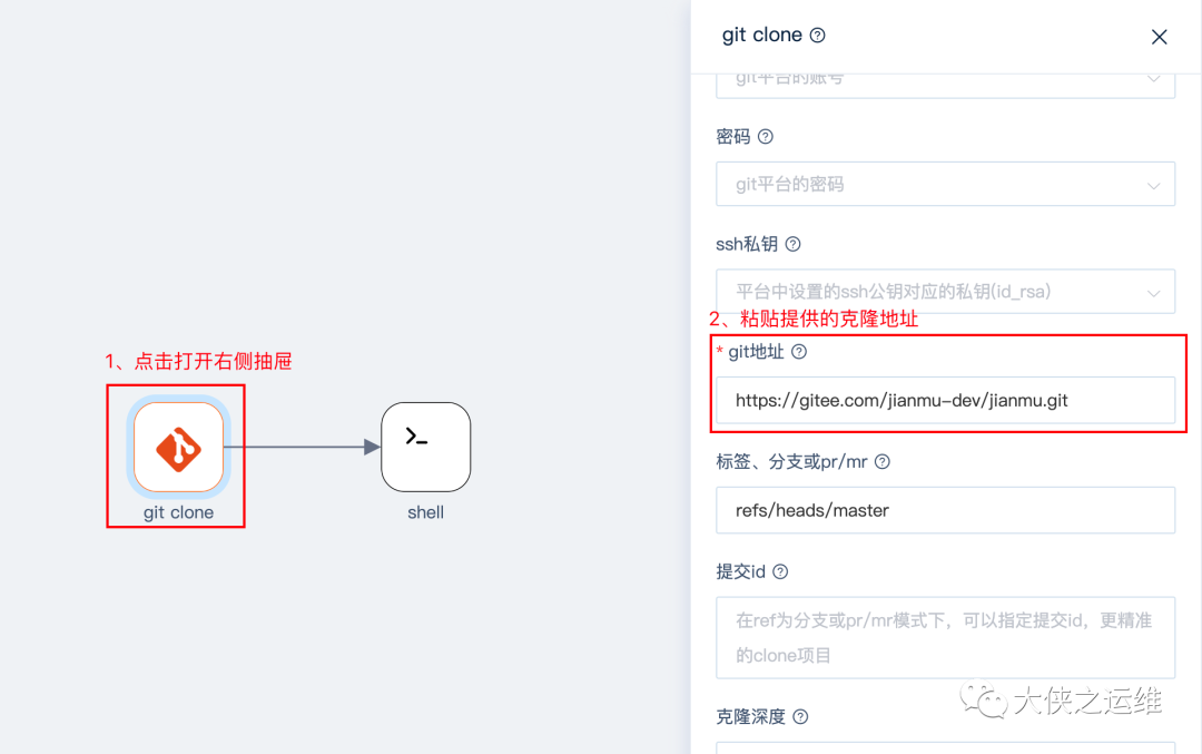 3、点击git clone节点,在右侧参数抽屉中找到git地址,粘贴克隆地址:https://gitee.com/jianmu-dev/jianmu.git。