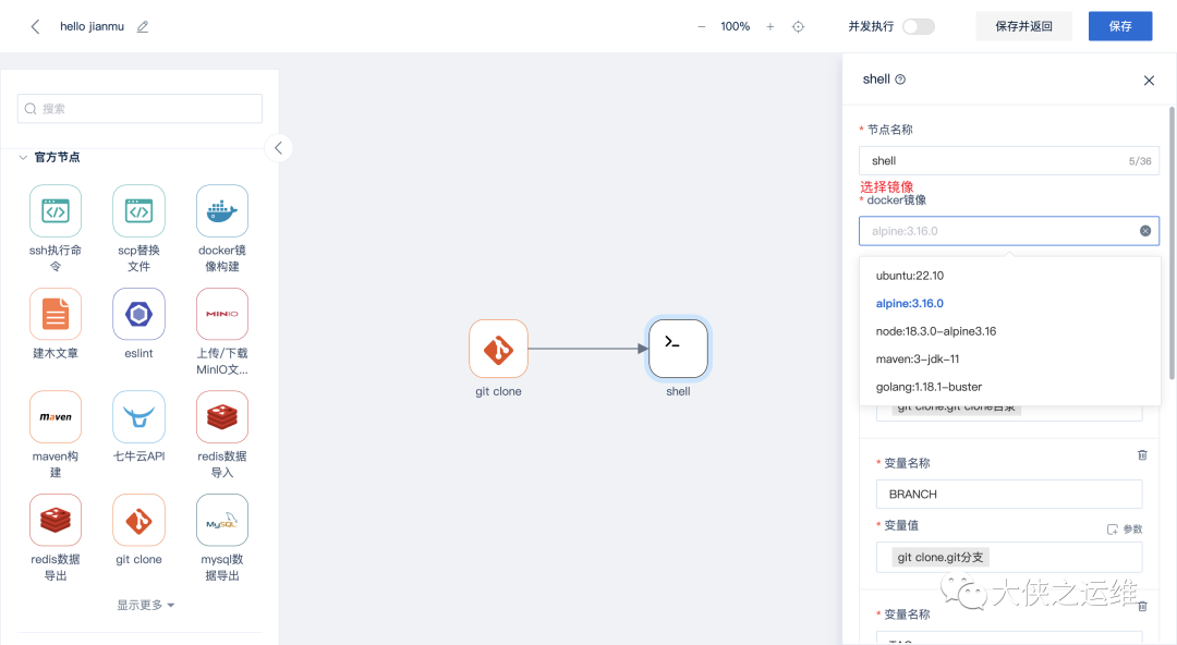 4、点击shell节点,在右侧参数抽屉中选择docker镜像alpine:3.16.0。