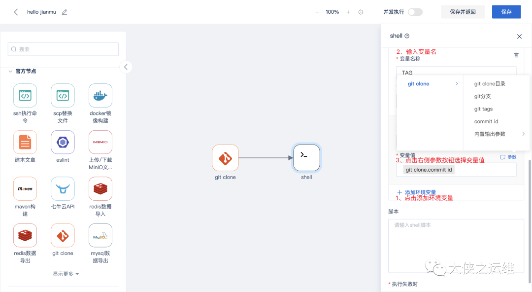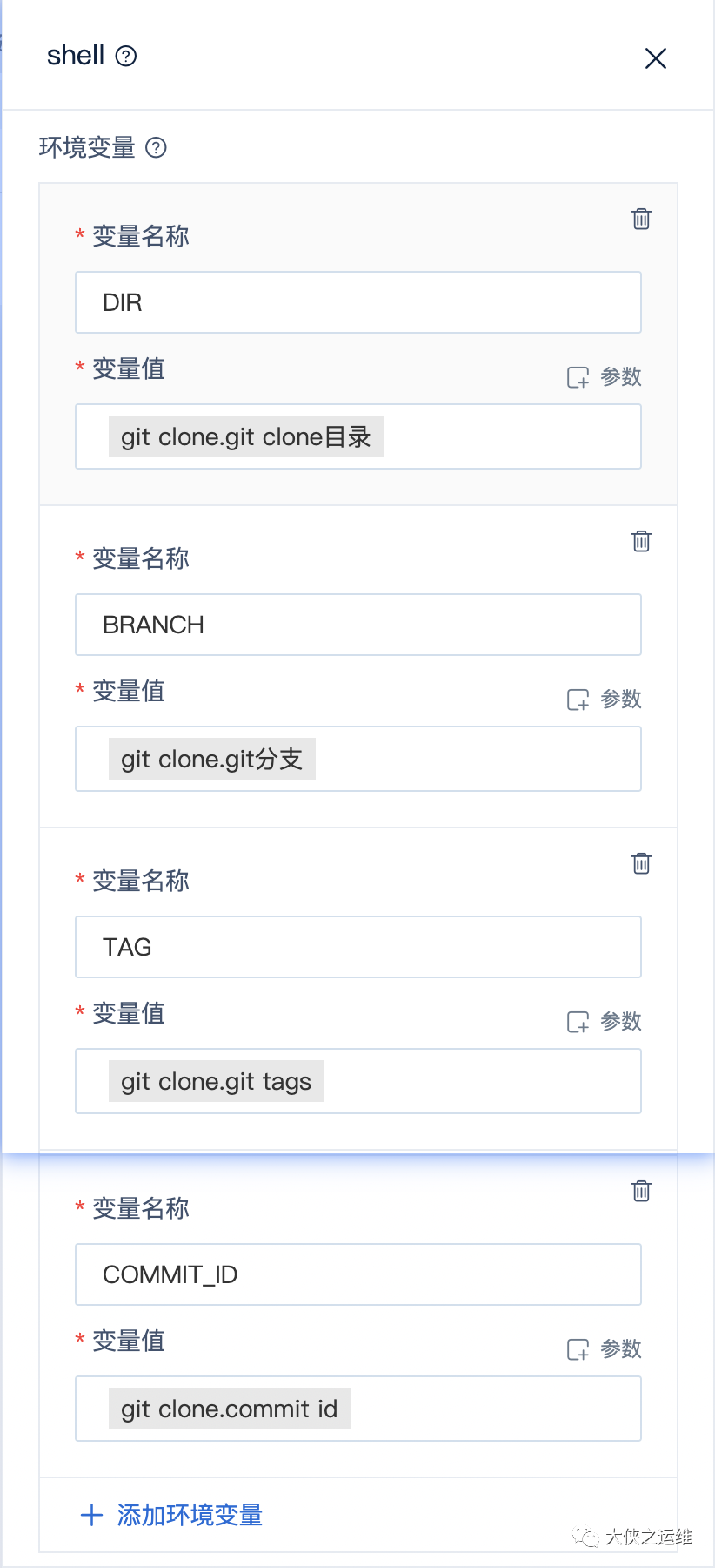5、新增环境变量。点击shell节点右侧参数抽屉中的添加环境变量+。输入变量名,点击变量值右侧参数按钮,可以选择对应的参数(只有和上游节点连接后才能选择参数)。