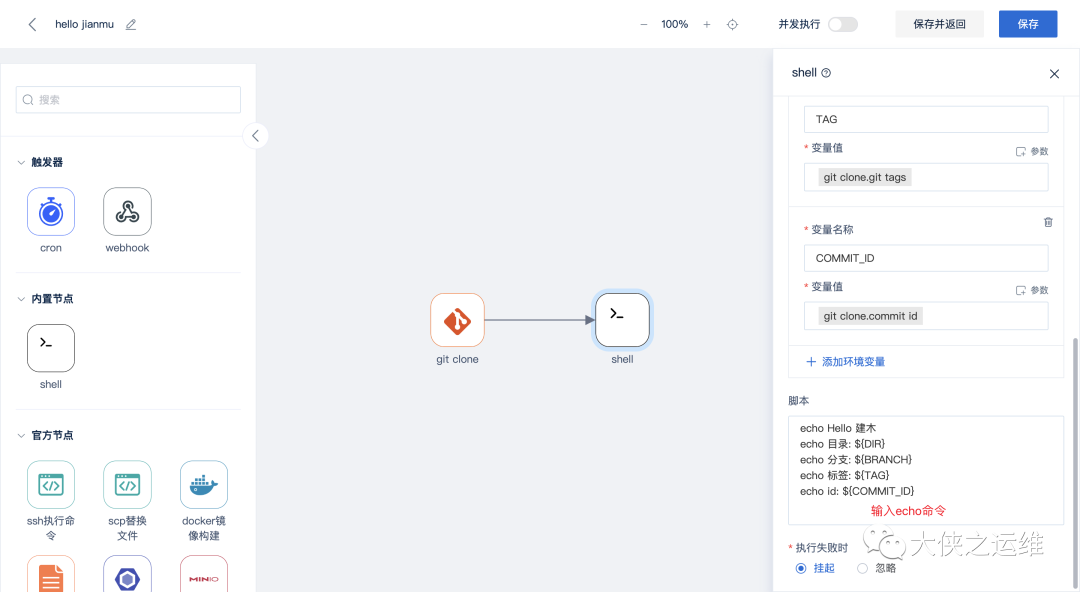 6、在shell节点右侧参数抽屉中的脚本中输入以下echo命令,执行后的日志中会输出这里定义的环境变量。脚本示例: