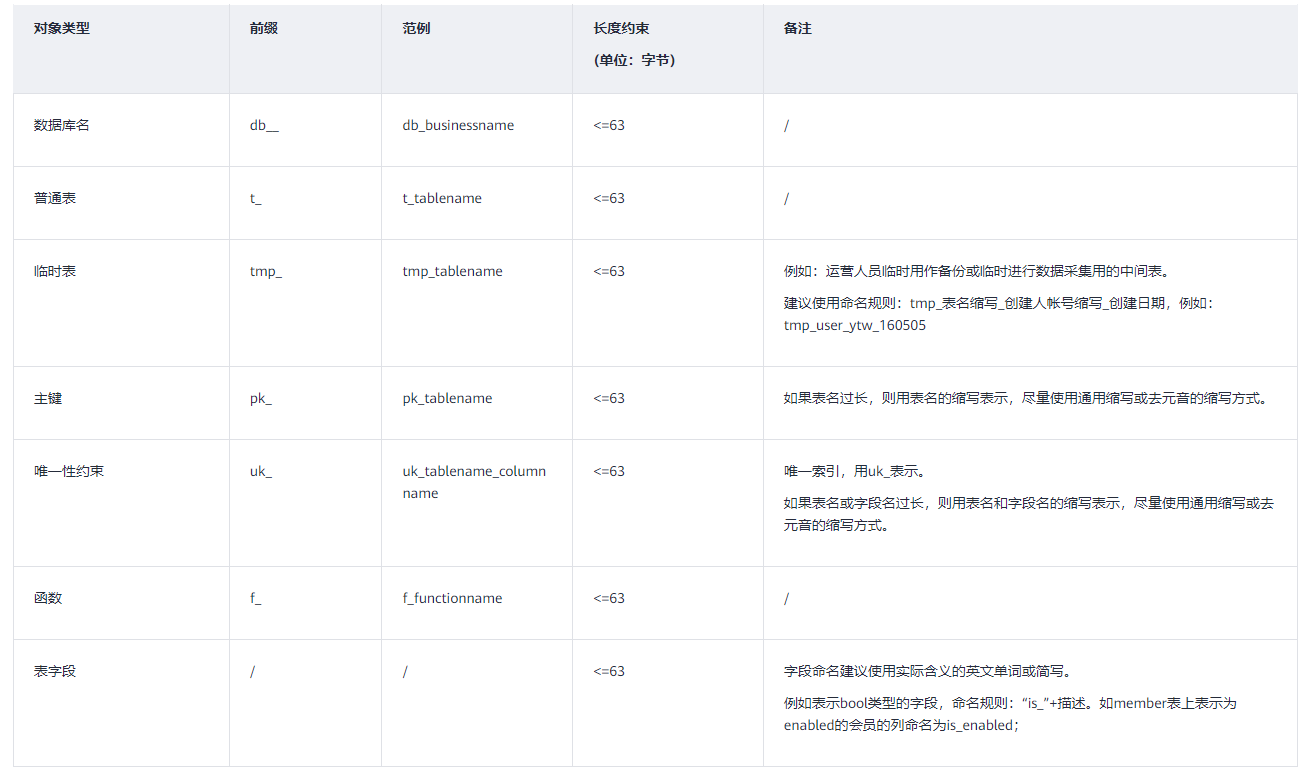 - 数据库对象命名需要满足约束:长度不超过63个字符, 以字母或下划线开头, 中间字符可以是字母、数字、下划线、$、#。