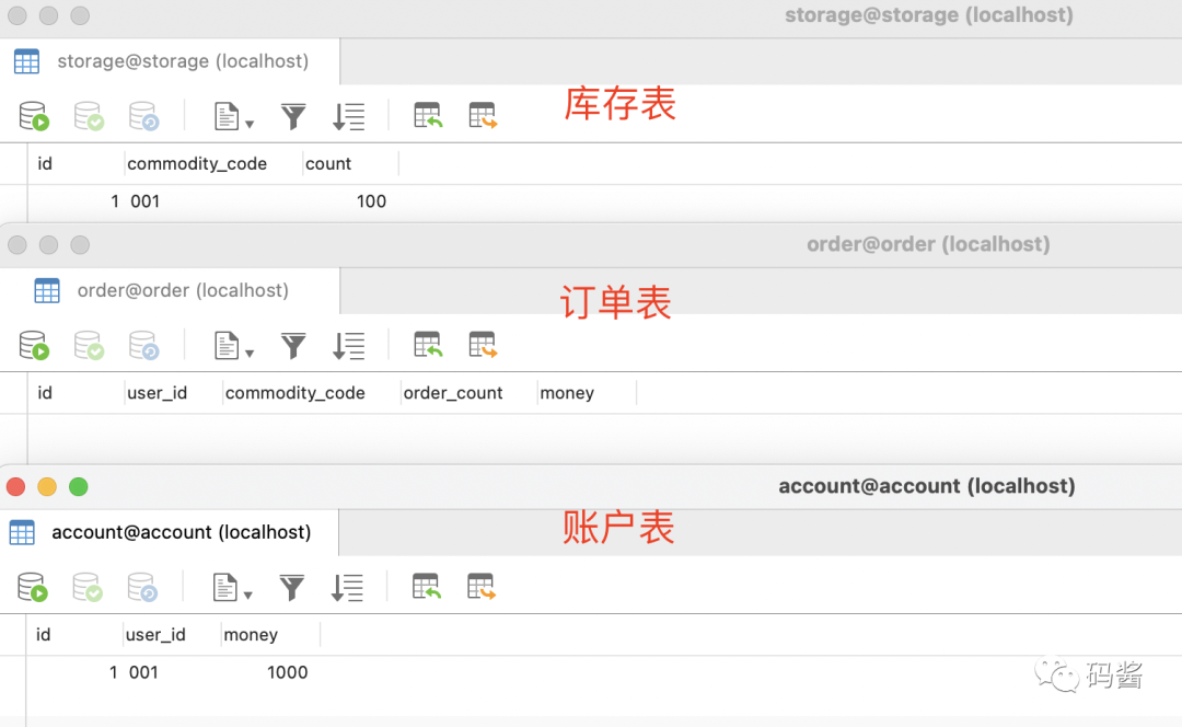 5.新建三张数据库表分别为account.account,storage.storage,order.order