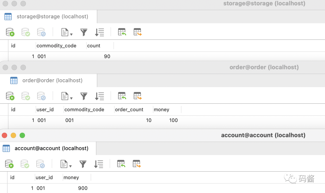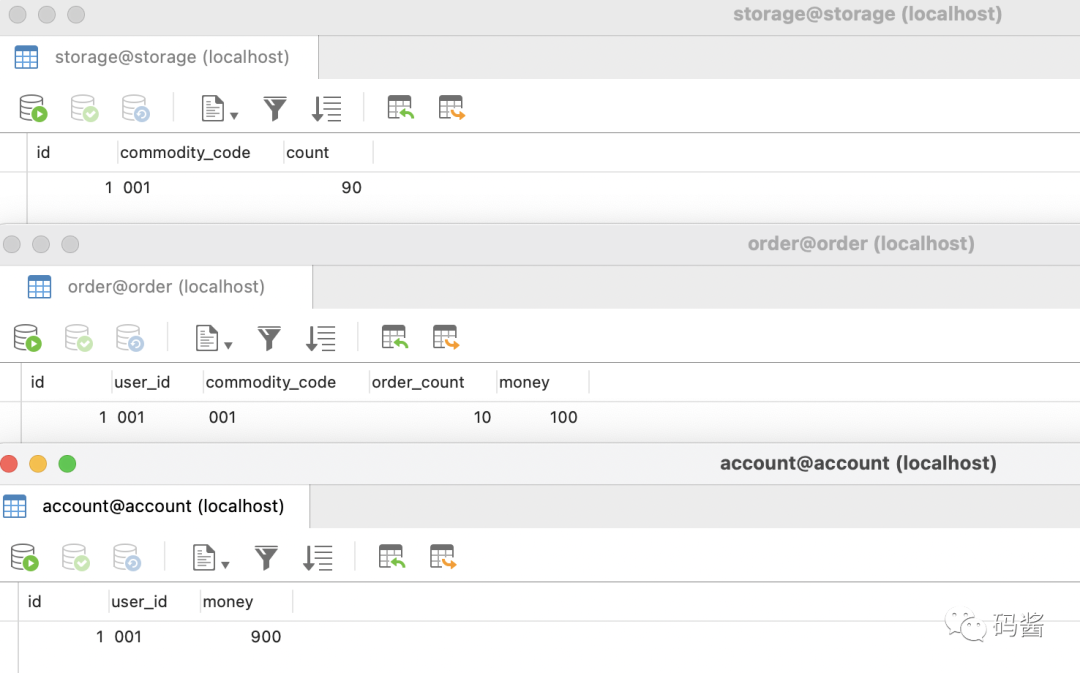 可以看到订单库新增一条订单,库存表001商品库存数量减10,账户表001用户余额减少10*10=100。
