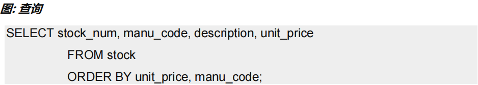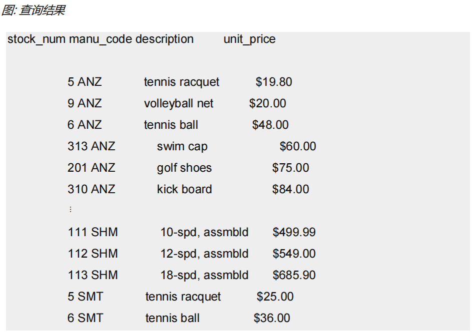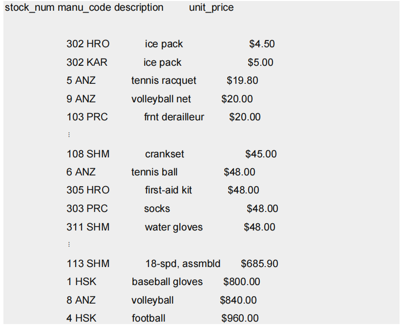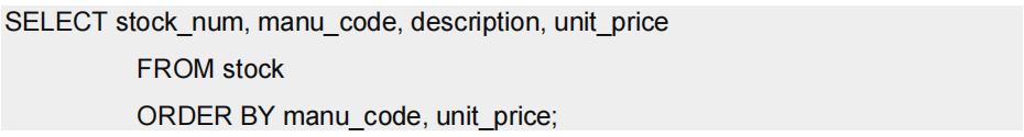 在此查询结果中,数据按 unit_price 的升序显示,其中两个或多个行具有相同的 unit_price(例如:$20.00 、$48.00 、$312.00),manu_code 以字母顺序显示。
