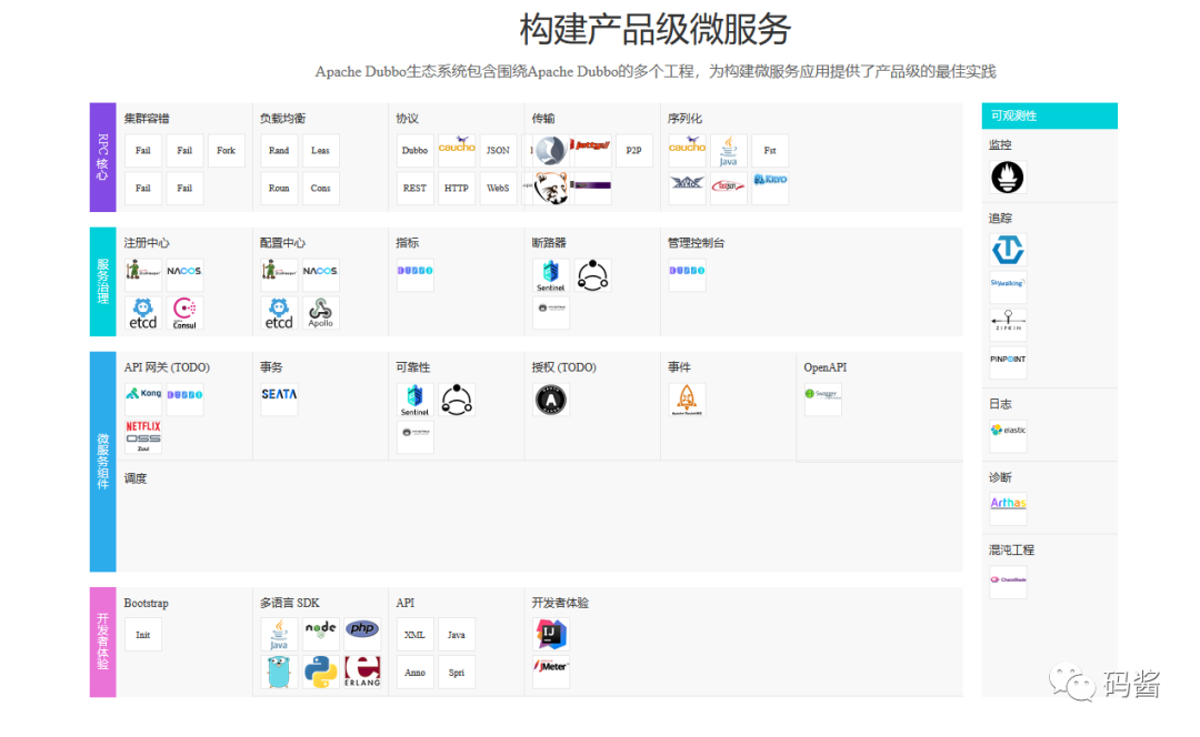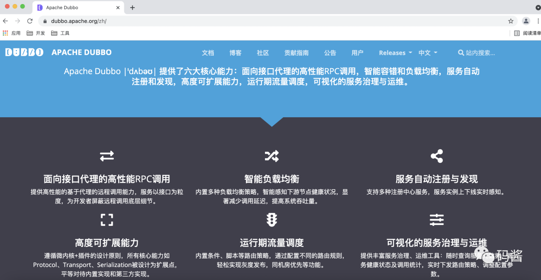 -- 2011 年 10 月 27 日,阿里巴巴开源了自己服务化治理方案的核心框架 Dubbo,服务治理的设计理念开始逐渐在国内软件行业中落地,并被广泛应用。自开源后,许多非阿里系公司选择使用 Dubbo,其中既有当当网、网易考拉等互联网公司,也有中国人寿、青岛海尔等传统企业。-- 2012 年 10 月 23 日 Dubbo 2.5.3 发布后,在 Dubbo 开源将满一周年之际,阿里基本停止了对 Dubbo 的主要升级。-- 2013 年,2014 年,更新了 2 次 Dubbo 2.4 的维护版本,然后停止了所有维护工作。至此,Dubbo 对 Spring 的支持也停留在了 Spring 2.5.6 版本上。-- 阿里停止维护和升级 Dubbo 期间,当当网开始维护自己的 Dubbo 分支版本 Dubbox,新特性主要包括:支持新版本的 Spring,支持 Rest 协议等,并对外开源了 Dubbox。同时,网易考拉也维护了自己的独立分支 Dubbok,可惜并未对外开源。-- 2017 年 9 月 7 日,Dubbo 悄悄在 GitHub 发布了 2.5.4 版本。随后,又迅速发布了 2.5.5、2.5.6、2.5.7 等版本。在 10 月举行的云栖大会上,阿里宣布 Dubbo 被列入集团重点维护开源项目,这也就意味着 Dubbo 起死回生,开始重新进入快车道。-- 2018 年 1 月 8 日,Dubbo 2.6.0 版本发布,新版本将之前当当网开源的 Dubbox 进行了合并,实现了 Dubbo 版本的统一整合。-- 2018 年 2 月 9 日,Apache 基金会的邮件列表上发起了讨论是否接纳阿里的 Dubbo 项目进入 Apache 孵化器的投票。经过一周的投票,邮件列表显示,Dubbo 获得了 14 张赞成票,在无弃权和反对票的情况下,正式通过投票,顺利成为 Apache 基金会孵化项目。-- 自此,Dubbo 开始了两个长期维护的版本,Dubbo 2.6.x (包名:com.alibaba)稳定维护版本和 Dubbo 2.7.x (包名:org.apache)apache 孵化版本。-- 2018 ~ 2019 年,在此期间,Dubbo 发布了 4、5 个版本,并发布了 nodejs,python,go 等多语言的客户端。在此期间,Dubbo 社区相继在北京、上海、深圳、成都、杭州、南京等地举办了开发者沙龙。-- 2019 年 1 月,2.7.0 release 版本发布,这个即将毕业的 apache 版本支持了丰富的新特性,全新的 Dubbo Ops 控制台。时至 5 月,Dubbo 来到了 2.7.2 版本,期间积极引入了新的特性,支持 consul,nacos,etcd 等注册中心。-- 2019 年 5 月 21 号,经过了漫长的孵化期,Dubbo 终于毕业,阿里巴巴又一开源力作成为Apache顶级项目。