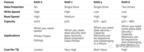 以下是常见的RAID的性能、高可用的对比。根据成本/性能/可用性来考虑使用哪一种存储阵列。