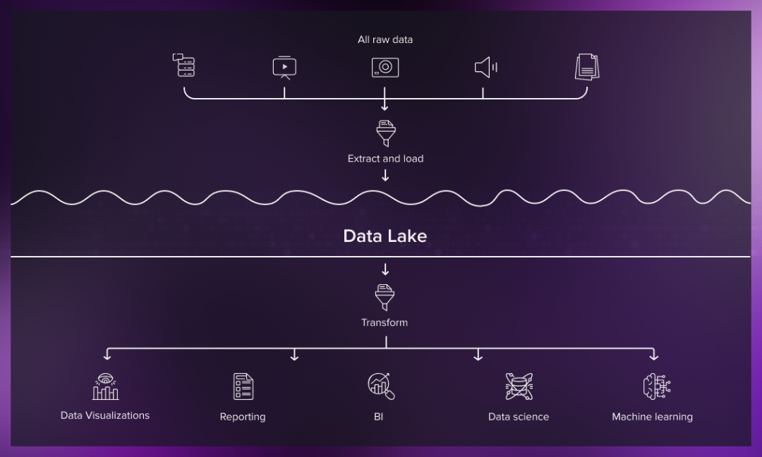 数据湖容纳了来自业务线应用程序的关系型数据,以及来自移动终端、IoT设备和社交媒体等方面的非关系型数据,而无需事先构建数据结构。这些多源异构的原始数据以几乎未经转换的状态存储,并在需要数据时再进行提取和分析;能够支持多种应用,如SQL查询、大数据分析、文本搜索、实时分析和机器学习等。