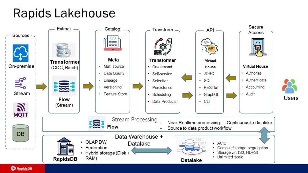 首先,与公司核心产品RapidsDB深度整合。通过与性能领先、应用广泛的分布式全内存数仓紧密融合,柏睿一体化流湖仓将为用户带来更高效、更强大的实时数据处理和分析能力。