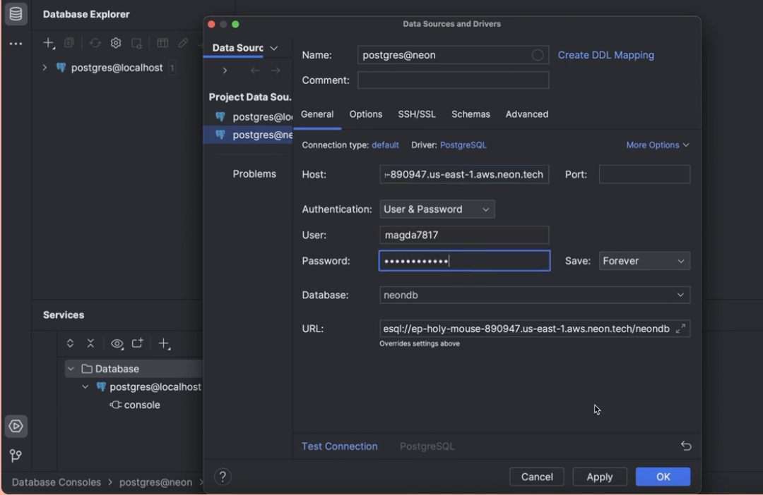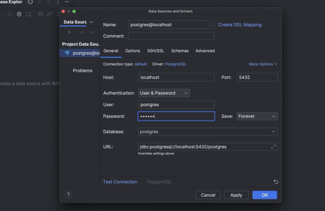 优势是巨大的—设置数据库非常快速,而且你知道吗?这一切都发生在硬件上。接下来,使用SQL编辑器,比如DataGrip,打开一个数据库连接。确保连接并使用之前提到的Docker命令中的用户名和密码。