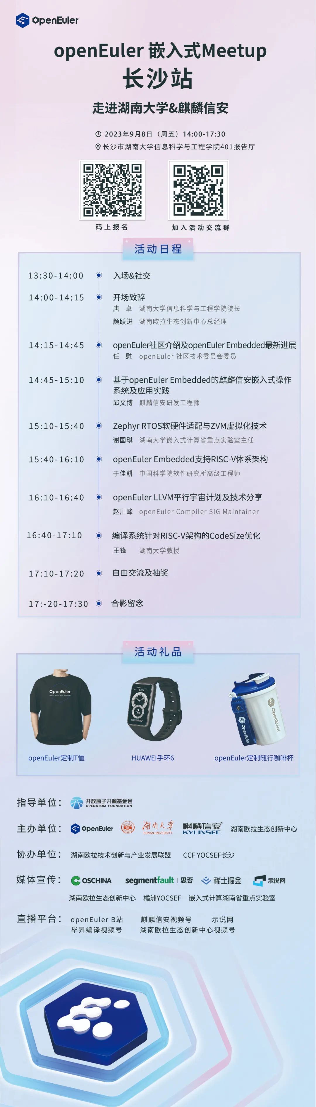 嵌入式技术新契机:本次Meetup将为广大开发者提供交流平台,除了联合主办方外更来自openEuler社区的SIG-Embedded, SIG-Yocto, SIG-RISCV, SIG-Compiler技术专家共同参与,面对面交流一同碰撞技术火花。 集大成之湖南大学:本次活动我们将走进湖南大学,湖南大学将为我们提供开阔的学术背景和研究资源。作为国内Zephyr项目的中坚力量,湖大嵌入式实验室将以此为契机,发挥自身的学术优势和技术实力,为构建一个开放、共享、协作的物联网操作系统生态圈做出贡献。openEuler社区也将和湖南大学探索更多合作的可能。 麒麟信安的智能安全嵌入:麒麟信安将为开发者们带来关于基于openEuler Embedded的麒麟信安嵌入式操作系统及应用实践。麒麟信安致力于为开发者们提供安全、高效的解决方案,为开发者们的创新保驾护航。 生态创新的集结:湖南欧拉生态创新中心作为引领技术创新的力量,将为我们提供一个展示和讨论最新创新成果的平台。在这里,您将与行业大咖和技术专家互动交流,开展合作伙伴关系,并获取有关嵌入式开发的最佳实践。