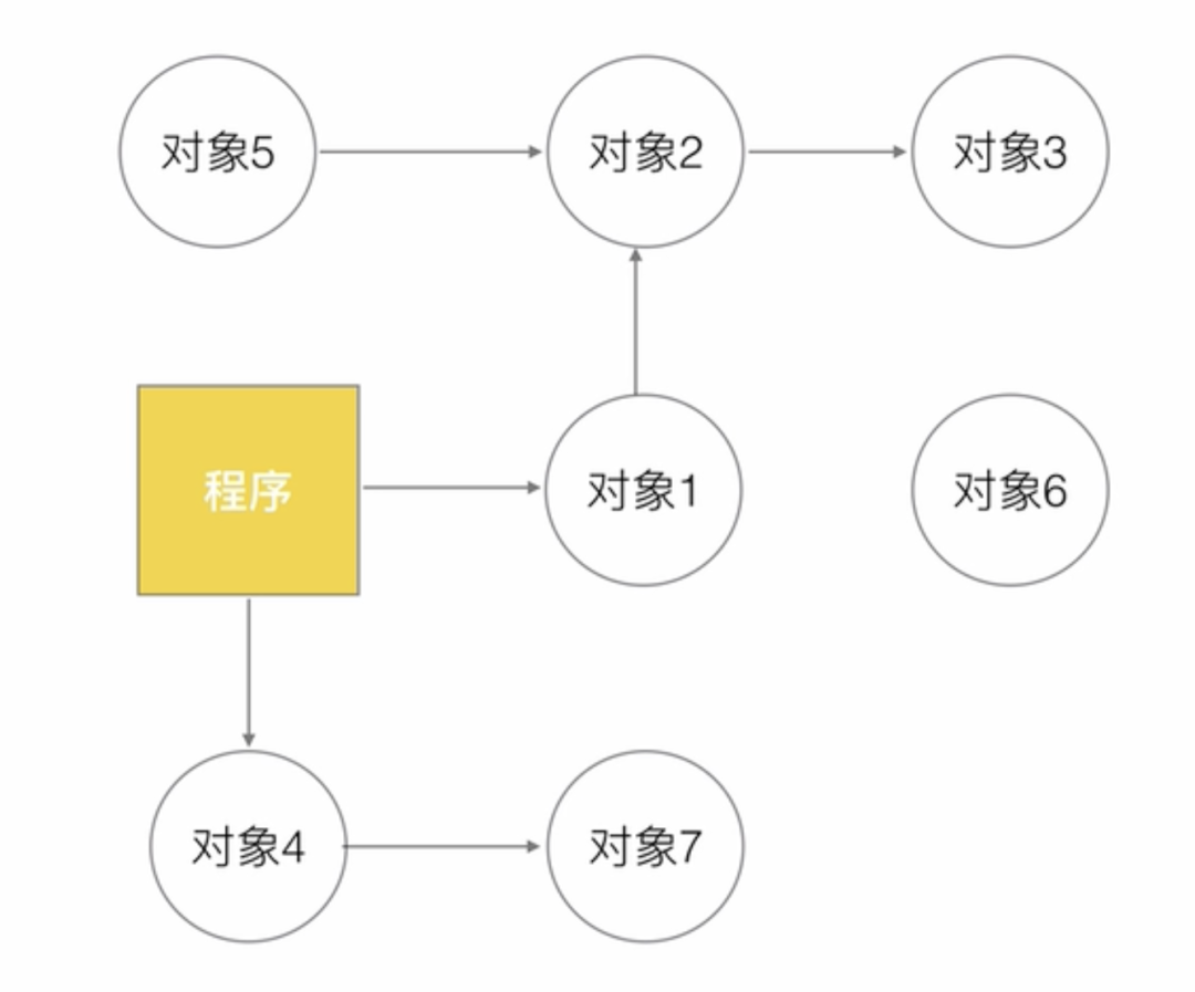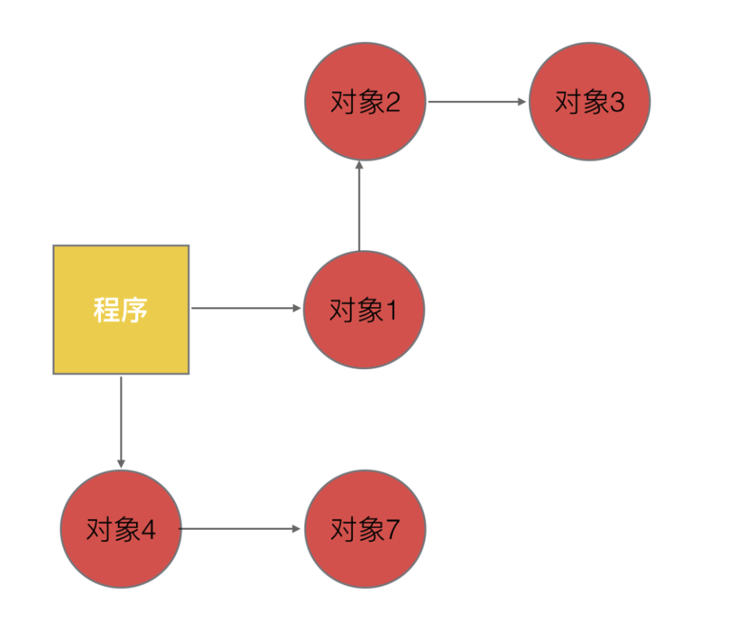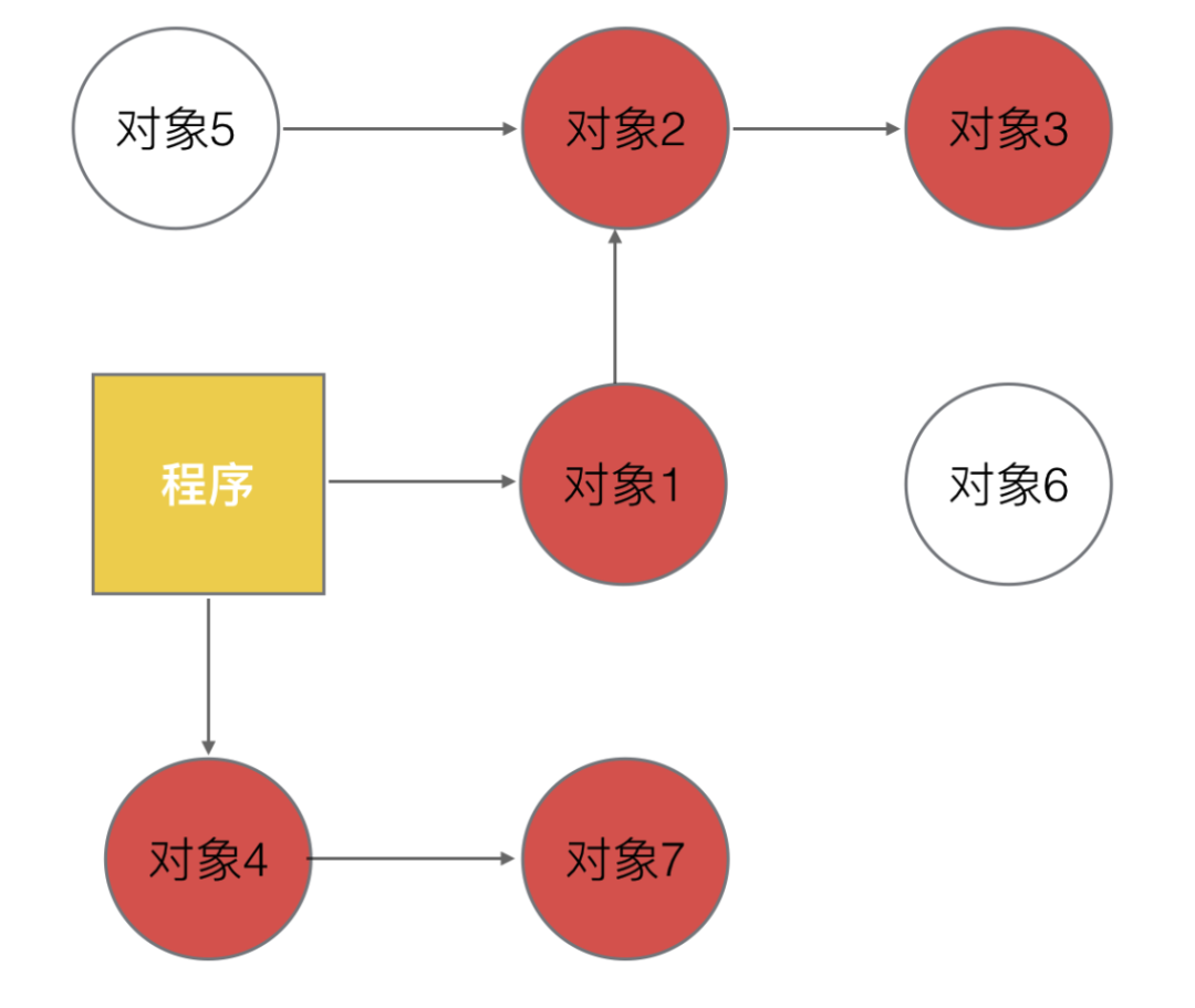 可达对象主要是指程序和对象有可达关系的对象。以上图为例,可达对象为 「对象1->对象2->对象3」、「对象4->对象7」五个对象。