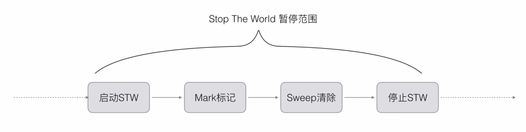 暂停STW(stop the world) 标记(Mark phase) 清除(Sweep phase) 停止暂停