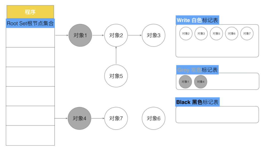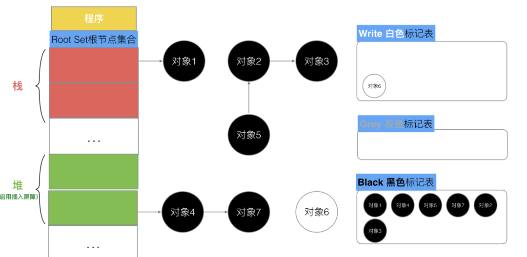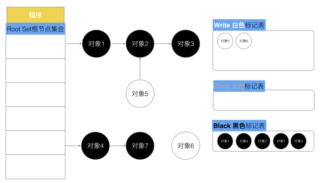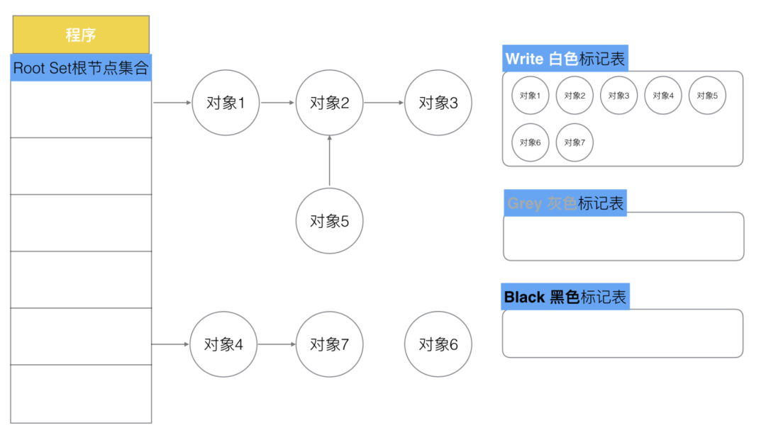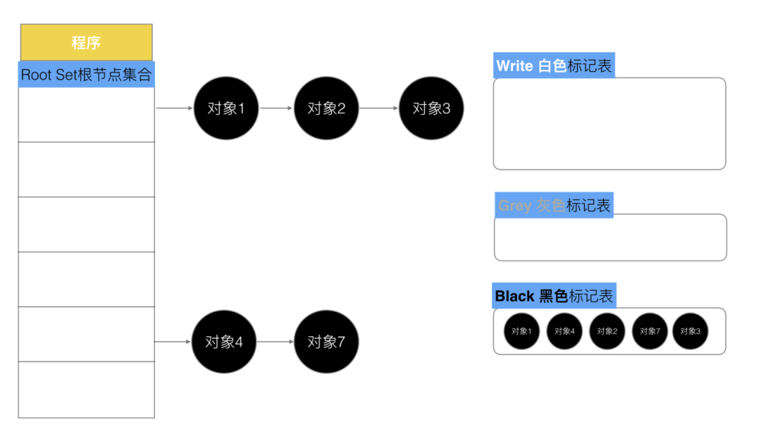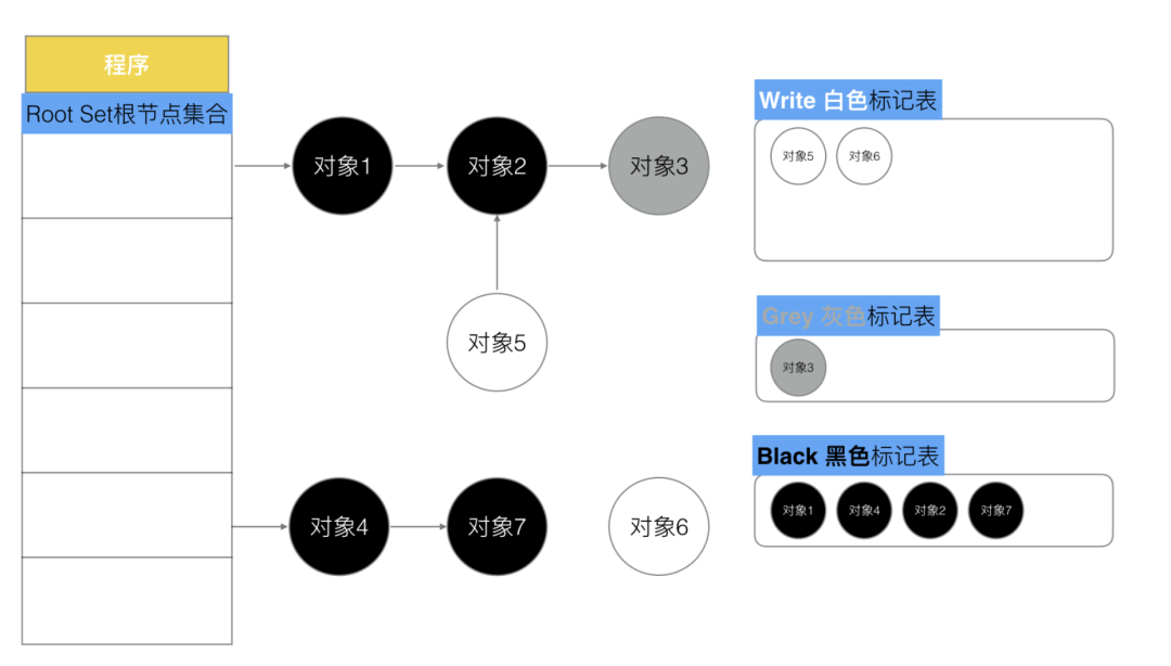 右边的标记表其实就是三种不同颜色的集合,被标记成哪种颜色,则对象就在哪个集合中。左边所说的程序,其实是一系列对象的根节点,如果我们把程序展开,则得到类似的表现形式
