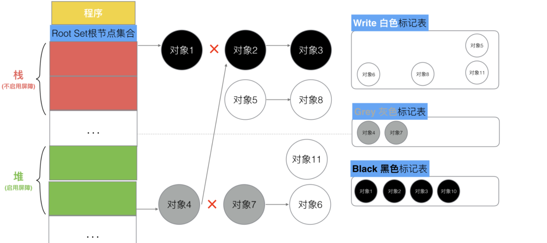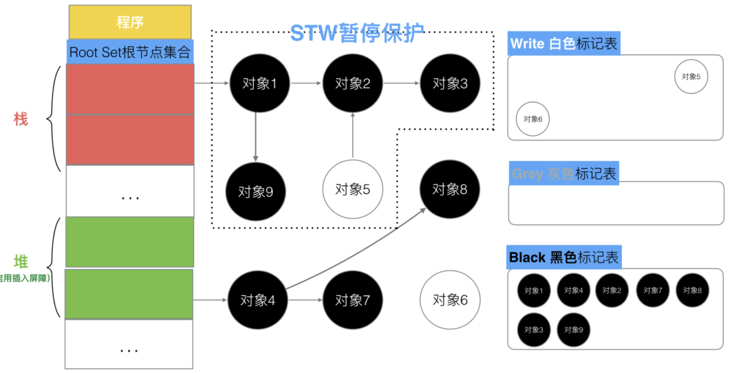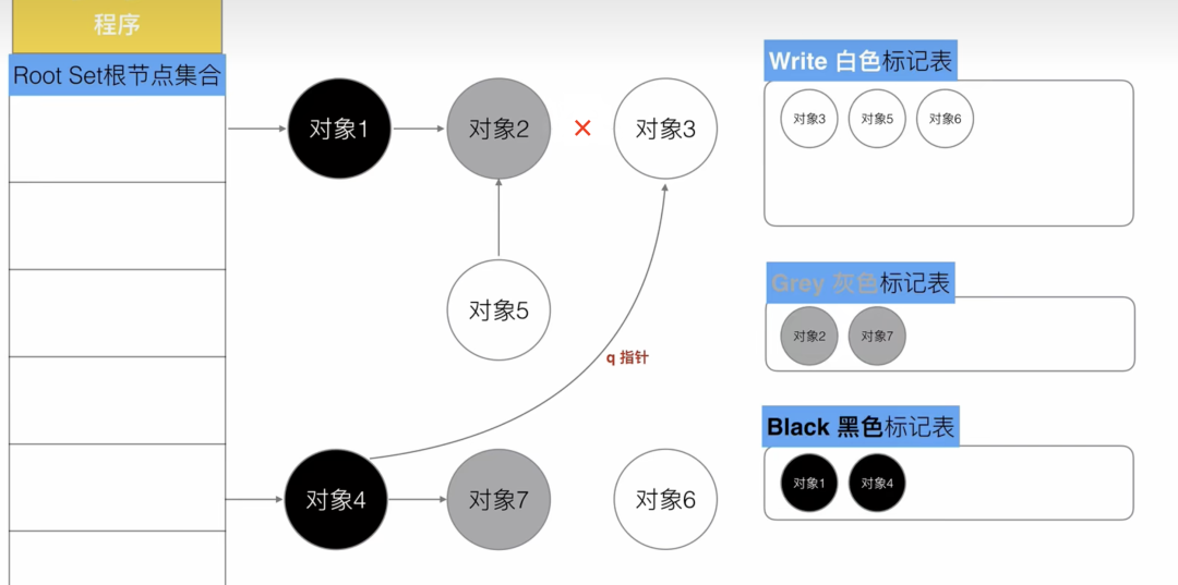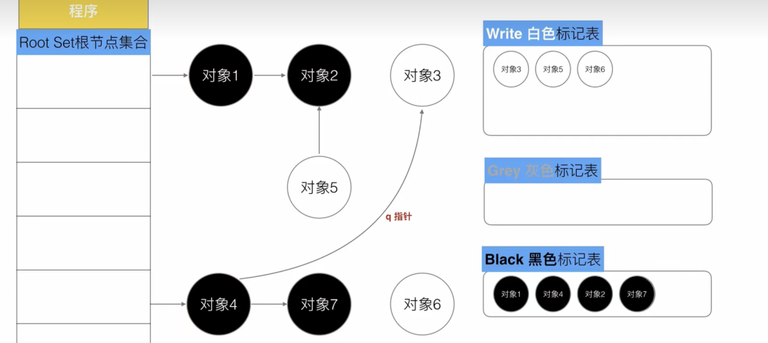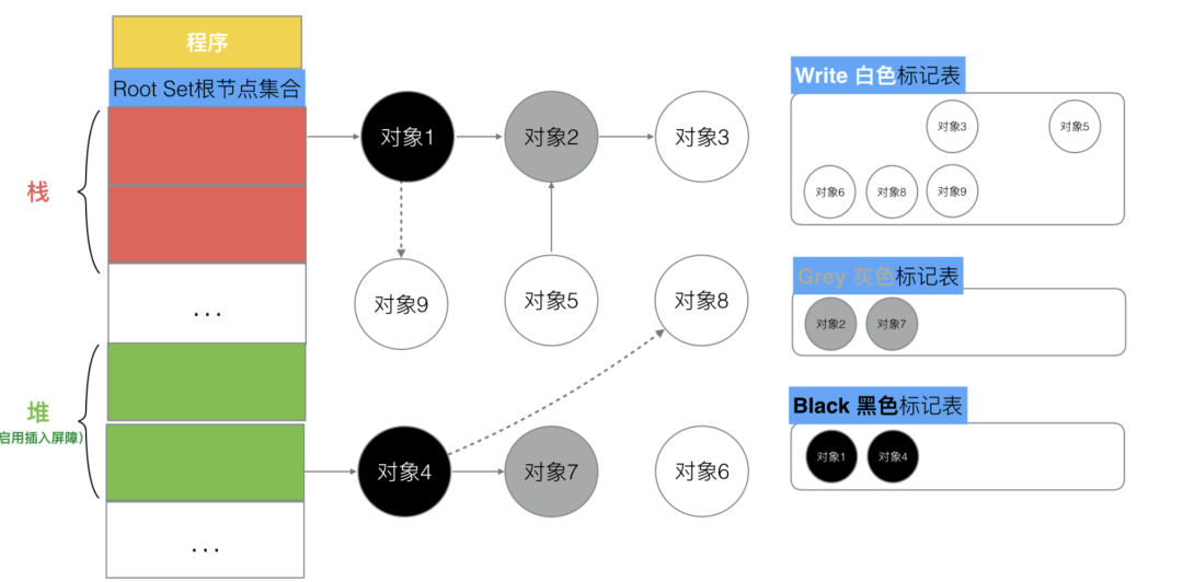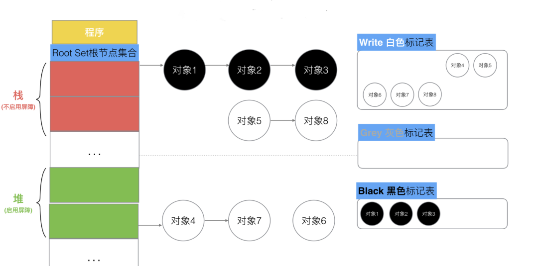 右边的标记表其实就是三种不同颜色的集合,被标记成哪种颜色,则对象就在哪个集合中。左边所说的程序,其实是一系列对象的根节点,如果我们把程序展开,则得到类似的表现形式
