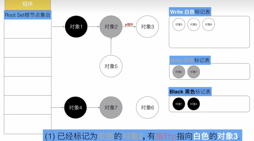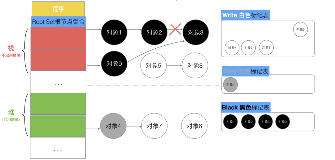 我们回到上面的例子,假设我们已经执行完了初始一次的扫描,标记了部分对象颜色,此时对象2是指向对象3的,也就是说正常情况下下一次扫描执行之后应该是对象2被标记为黑色,对象3被标记为灰色。