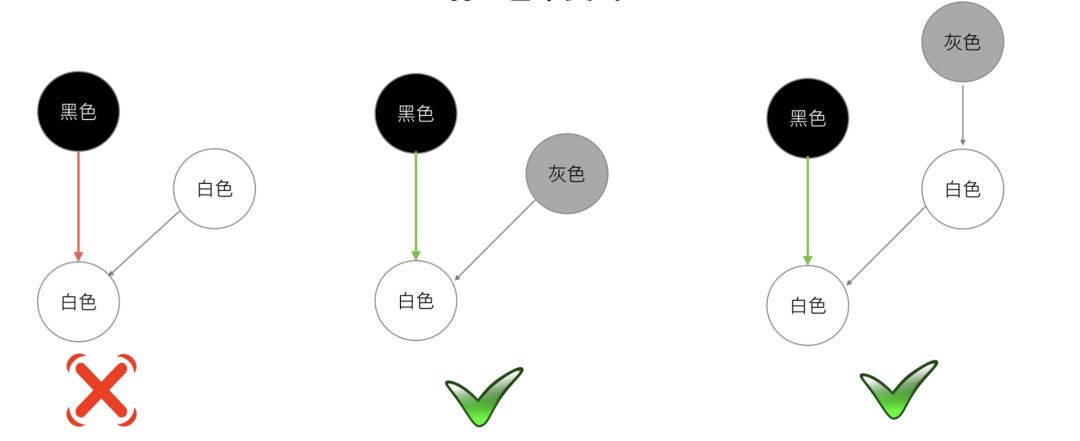 不允许黑色对象直接指向白色对象,这样就不会有白色对象被误删的情况
