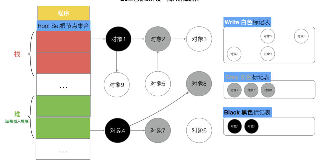 程序根节点是分为栈空间和堆空间的,只有堆空间的对象启用插入屏障机制 因为并发等各种原因,此时对象4需要指向对象8,对象1需要指向对象9