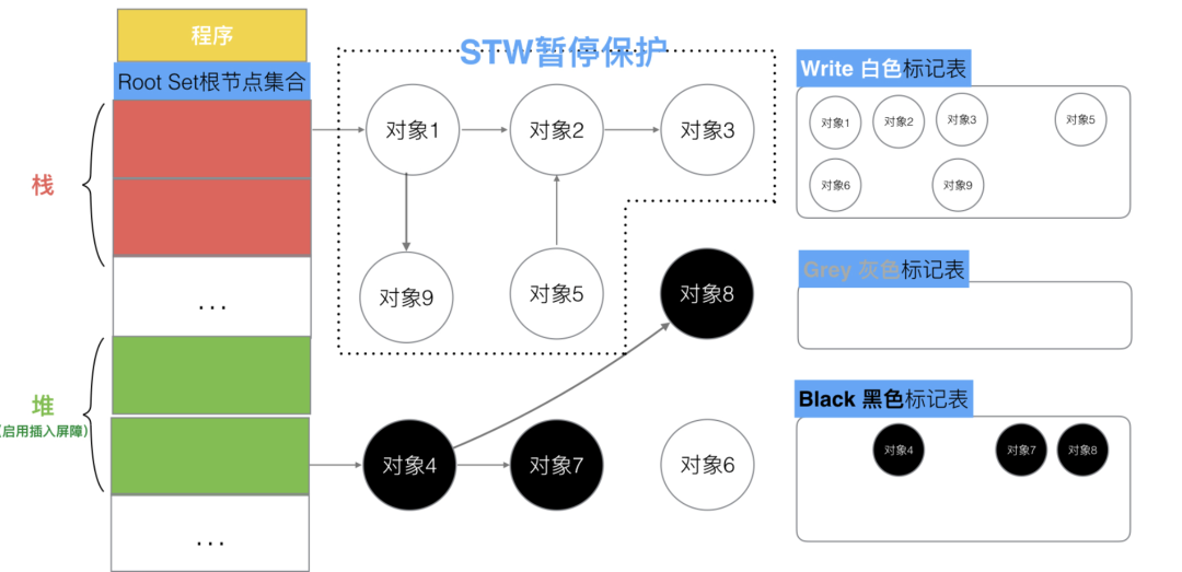 GC开始将栈上的对象全部扫描并标记为黑色(之后不再进行第二次重复扫描,无需STW),