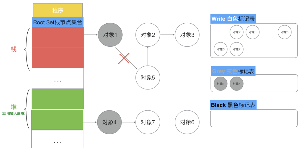 在三色标记的过程中,对象1还未来得及把对象5标记为灰色的时候就已经断开了链接。可想而知,这么执行下去的话对象5以及对象2对象3后面都会被清除。