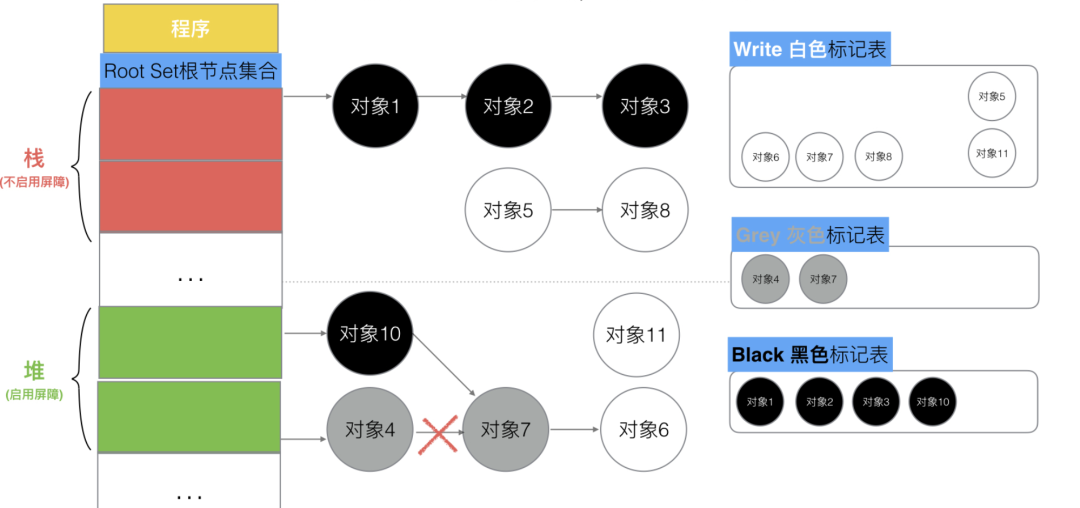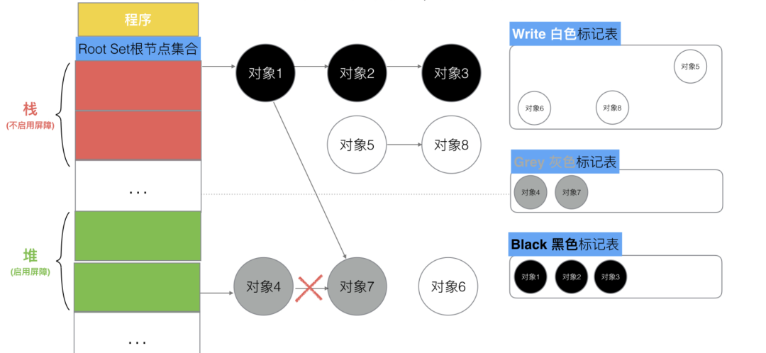 因为在堆对象删除的时候,触发了写屏障,所以对象7被标记成了灰色。保证后续安全